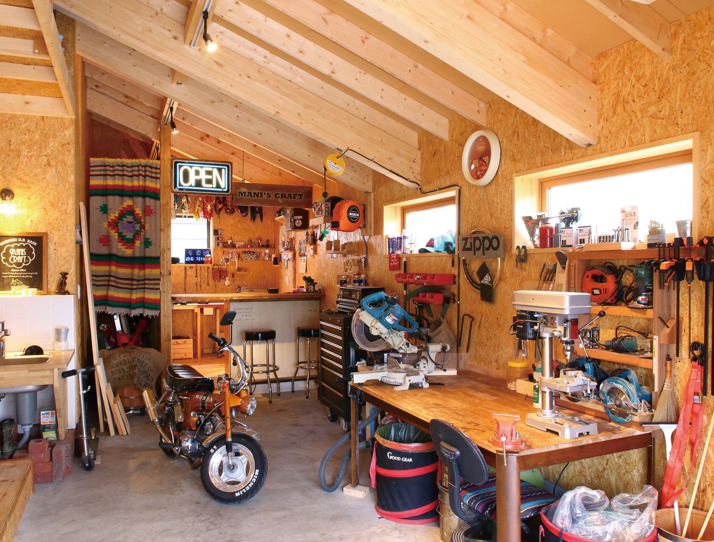 Sさんがアンサーで家を建てたいと思ったのは、「5年ほど前に妹がアンサーで家を新築して、それを見ていいなと思って。家族でも『いつかあんな家がほしいね』と話していました。ただなかなか希望に合った土地が見つからなかったんです( Sさん)」。Sさんには木工、皮小物作り、バイクのレストア(復元)など幅広い趣味があり、家を持つなら思う存分趣味を楽しめる広いガレージがほしいと思っていた。念願の70坪超という理想的な広さの区画が出てからのSさんの決断は早かった。
