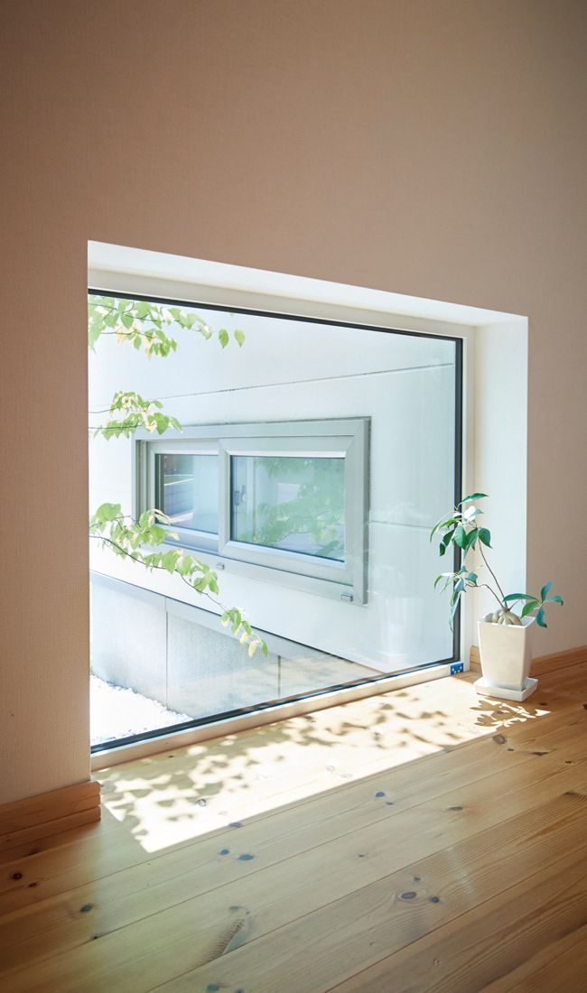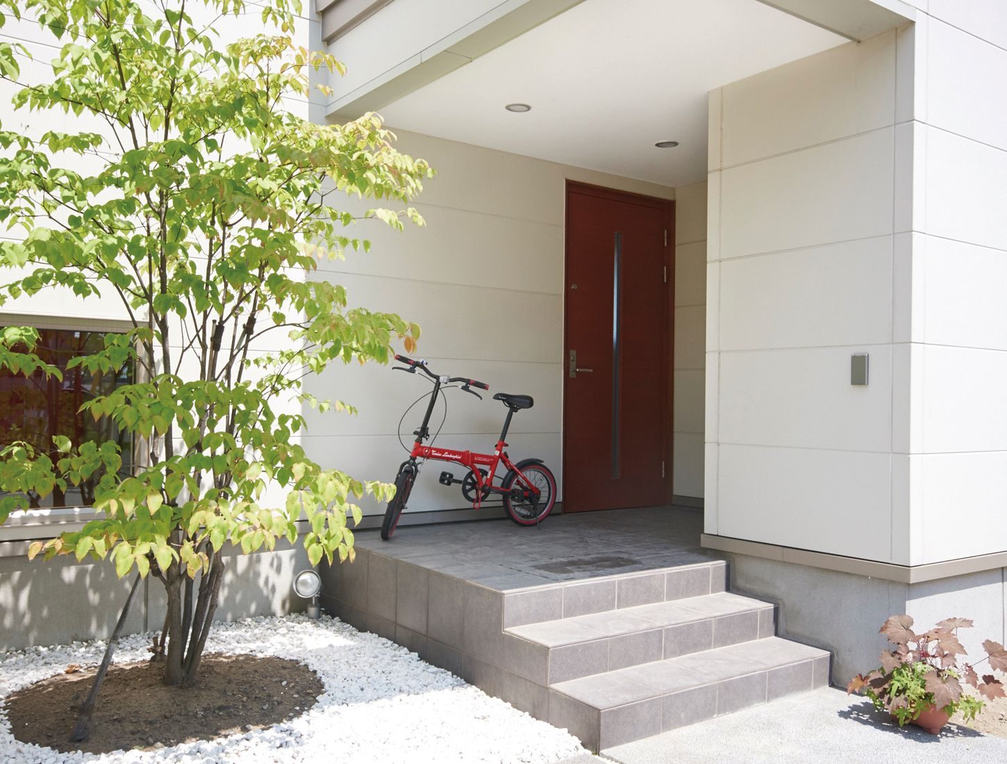 エントランスから望む坪庭の佇まいが印象的なK邸。住みはじめて3年、この家での暮らしがすっかりなじんだ今でも、折々に「いい家だなぁ」と家族で言い合うのだという。