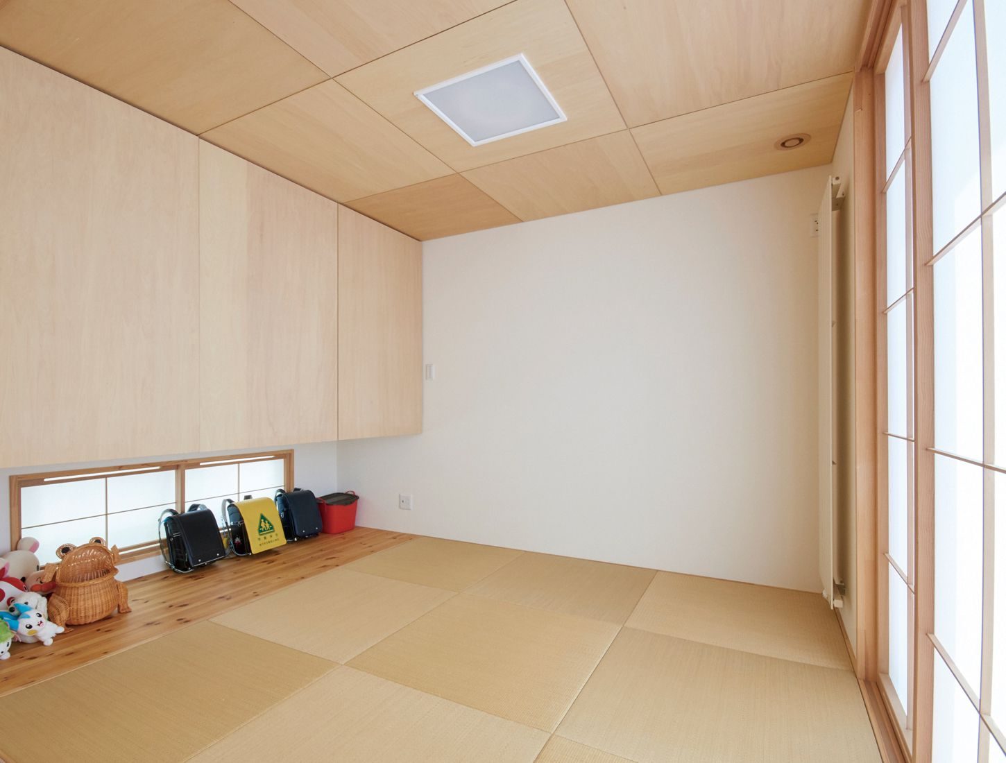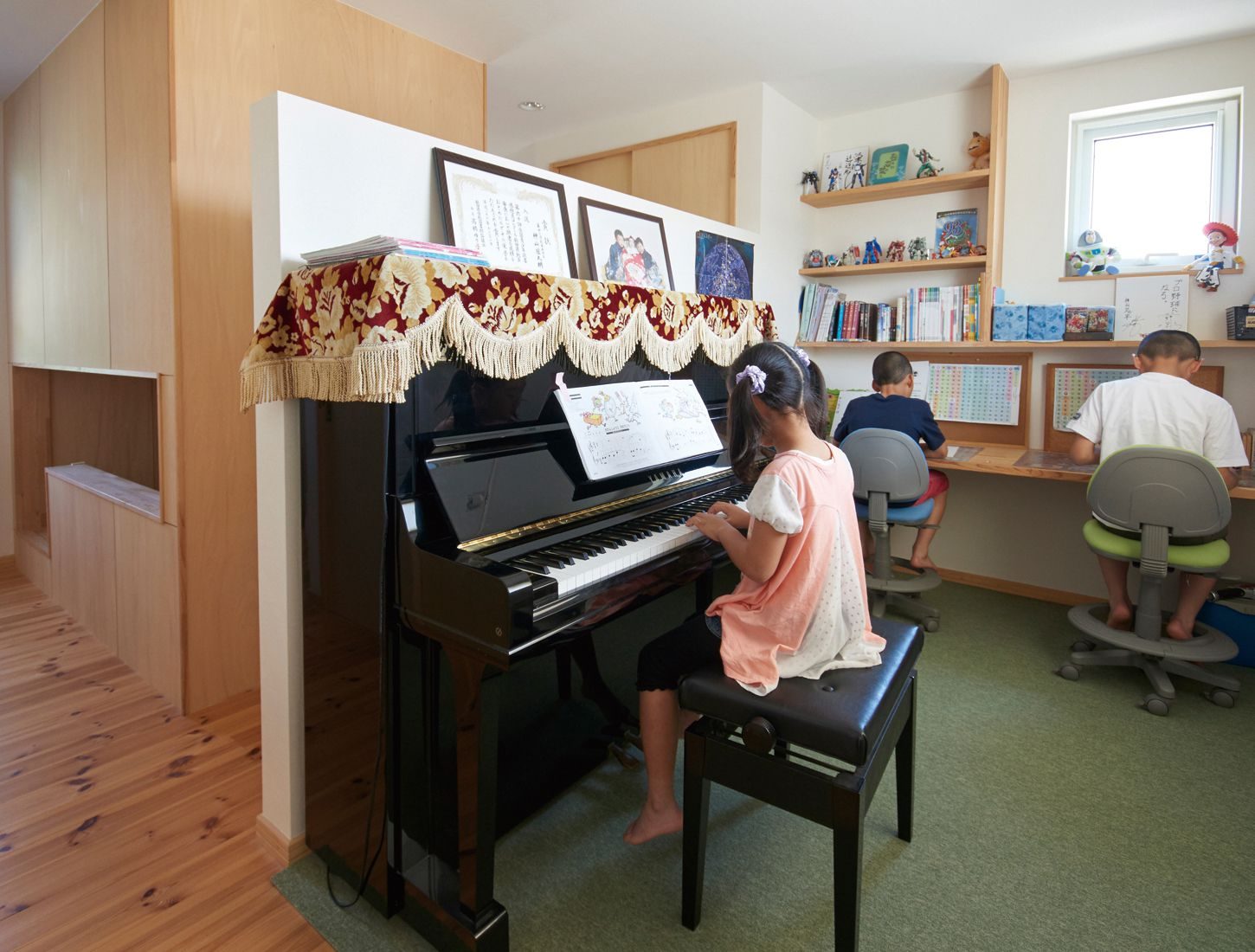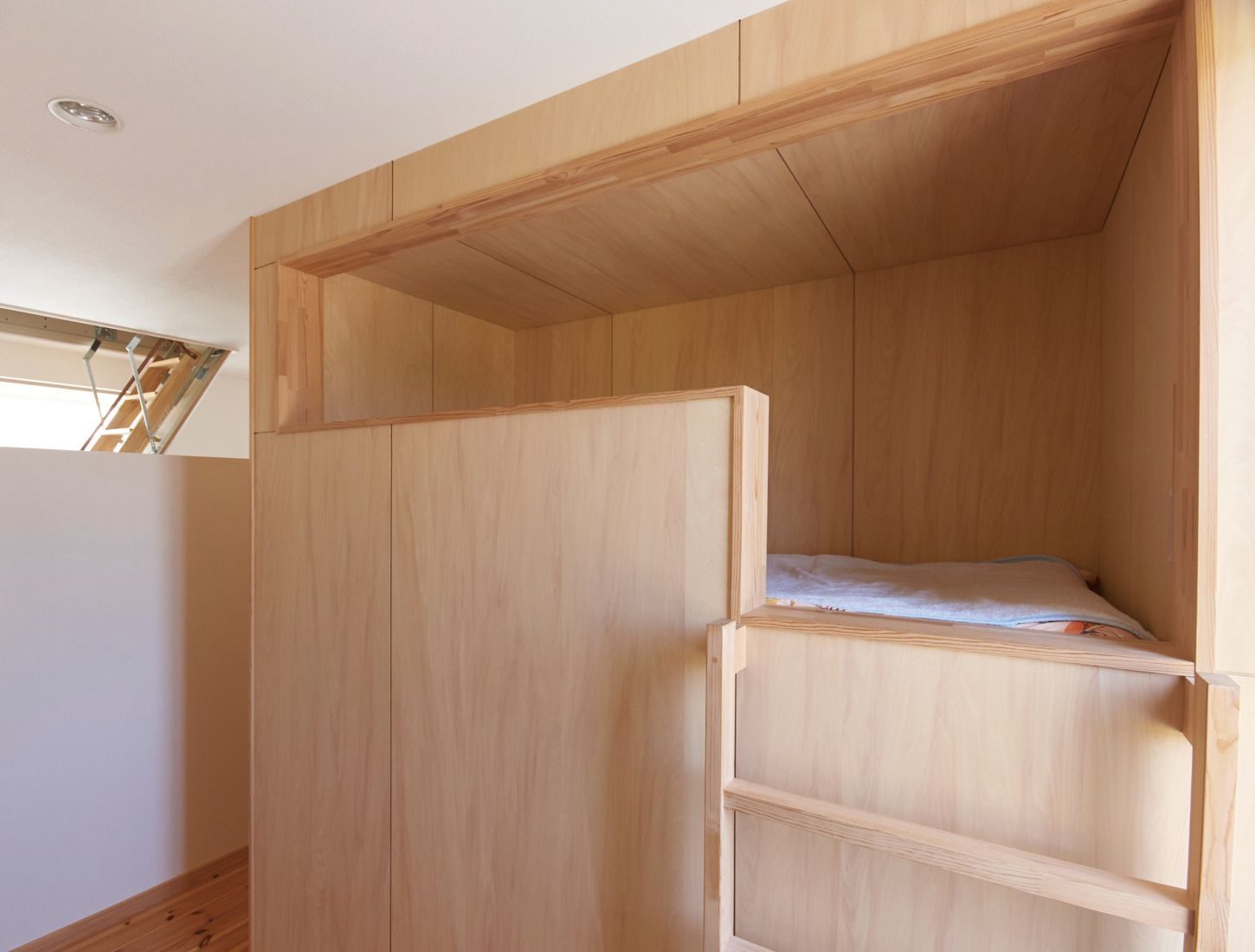 間取りで工夫が見られるのが子ども部屋。K家には長男の瑶太郎くん(11歳)を筆頭に、芯平くん(9歳)、栞夏ちゃん(6歳)の3人の子どもがいる。3人分の個室をつくるのはいささか大げさに思えるが、成長に伴い、一定のプライバシーは必要になる。悩んだKさんに、鈴木さんの提案は一つのフリーホールを兄妹3人で共有とし、造作二段ベッドの脇にそれぞれ勉強机が置けるスペースを確保するプラン。それなら3つのスペースができて、成長に合わせて空間を柔軟に使うことが可能な工夫がなされている。「こういうこともできるんだ! と目からウロコでしたね」とKさん。