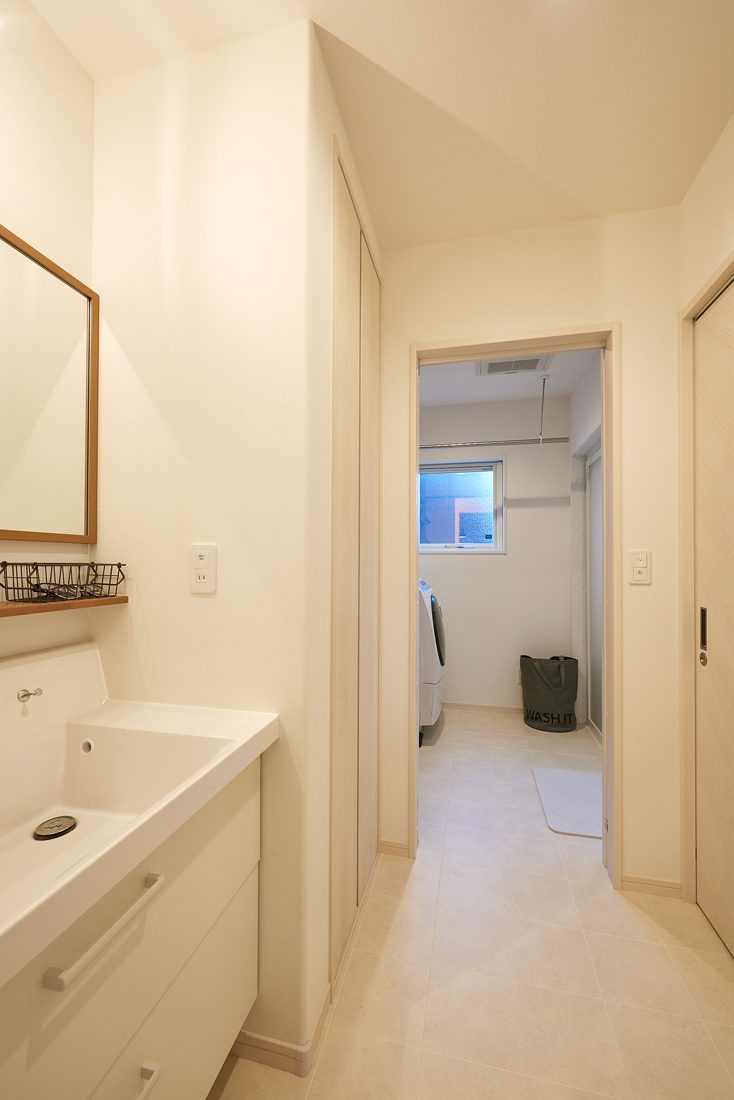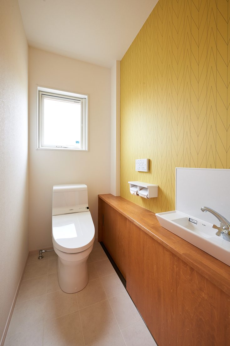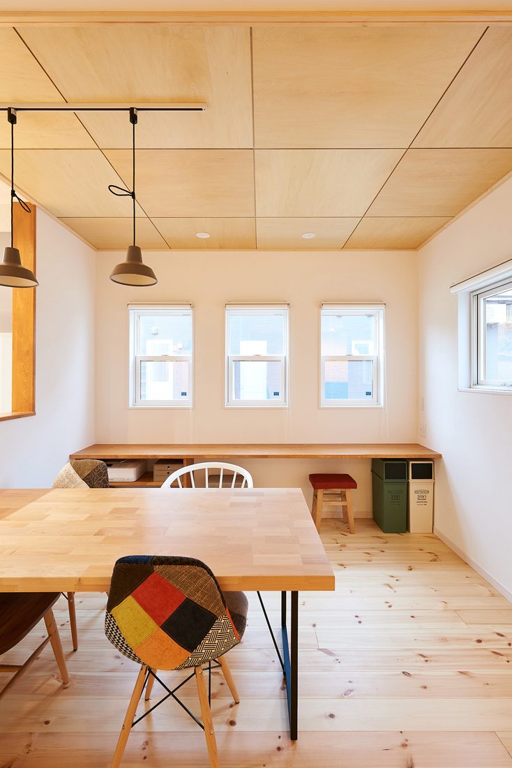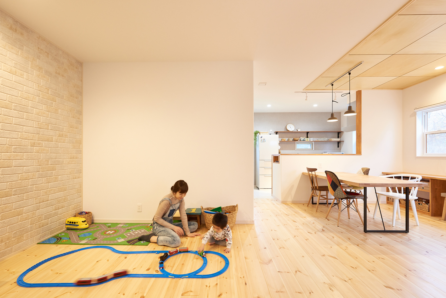 果樹園の一角を分譲地にしたような豊かな緑に囲まれた場所に、シルバーのガルバリウムの外観が映えるA邸。1階はほとんど仕切りのないワンルームで、リビング、ダイニング、キッチン、和室までが一目で見渡せる。無垢のパイン材は足触りも柔らかく、寒い季節も冷たさを感じにくい。妻のSさんは「子どもと床で遊ぶときは特に良さを実感します」と話す。仕切りのない1階はダイニングの天井にはシナベニヤを張ったり、床材を使い分けることで柔らかく用途を区切っている。脱衣所やトイレから独立した洗面所は、スムーズな動線により朝の慌ただしさをぐっと軽減している。