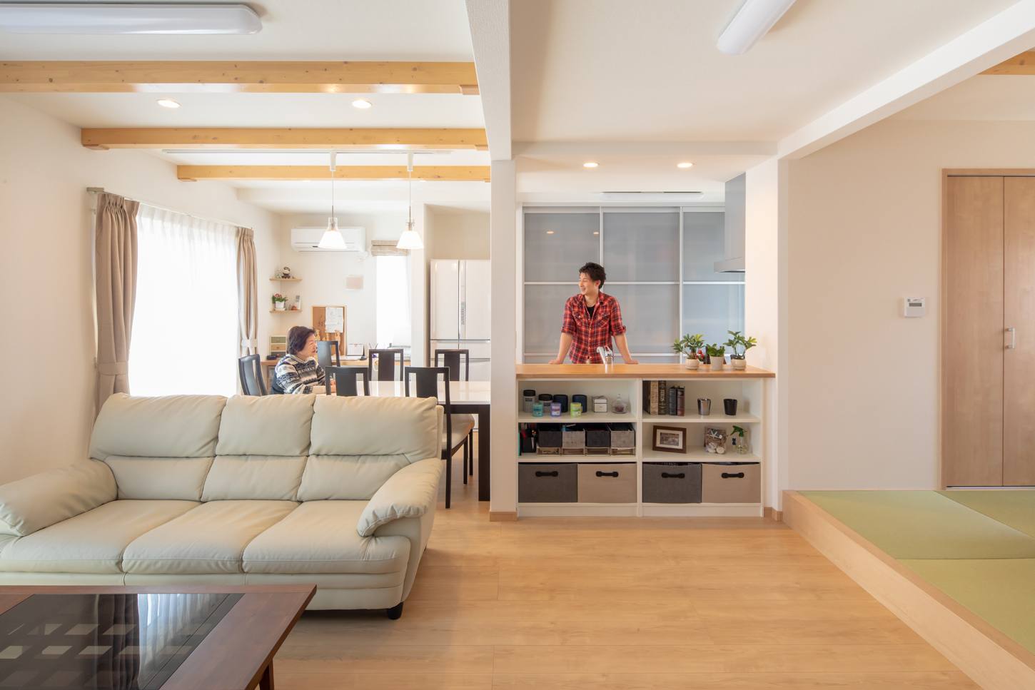 H邸は3世代6人家族。建て替えでの家づくりだが、元々は延床面積70坪の家に母のKさんが一人で住んでいたという。Hさん家族は近くの貸家を借りていたが、「広い家に義母が一人で暮らしていて心配でしたし、年数が経っていたこともあって維持も大変でした。私たちが借りていた家も、古かったこともあって寒くて、この際建て替えて同居しようとなったんです」と妻のYさん。建て替えが決まってすぐに石井建築設計事務所に依頼した。