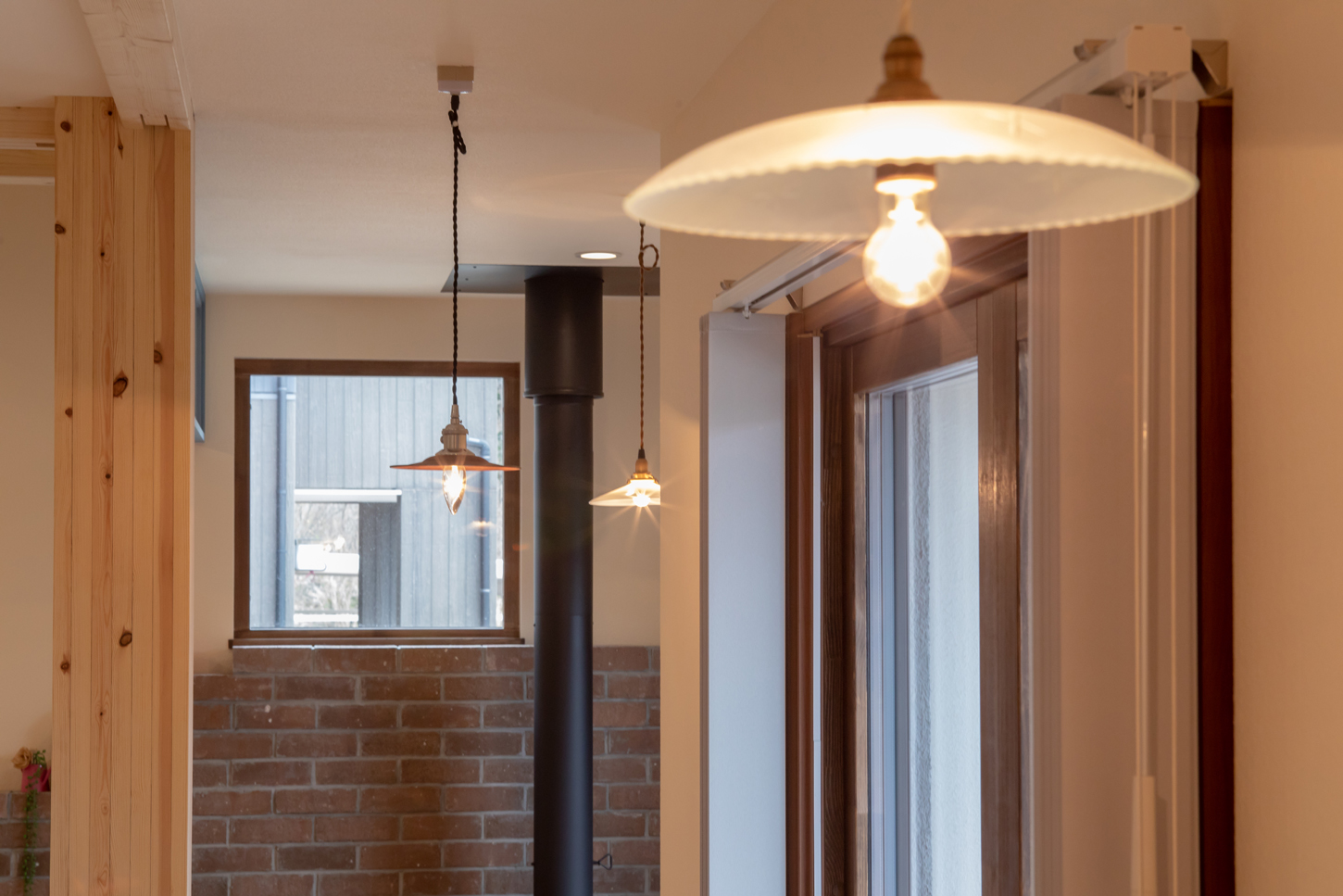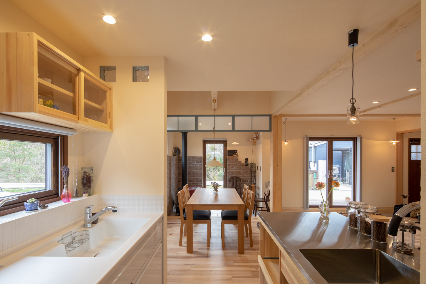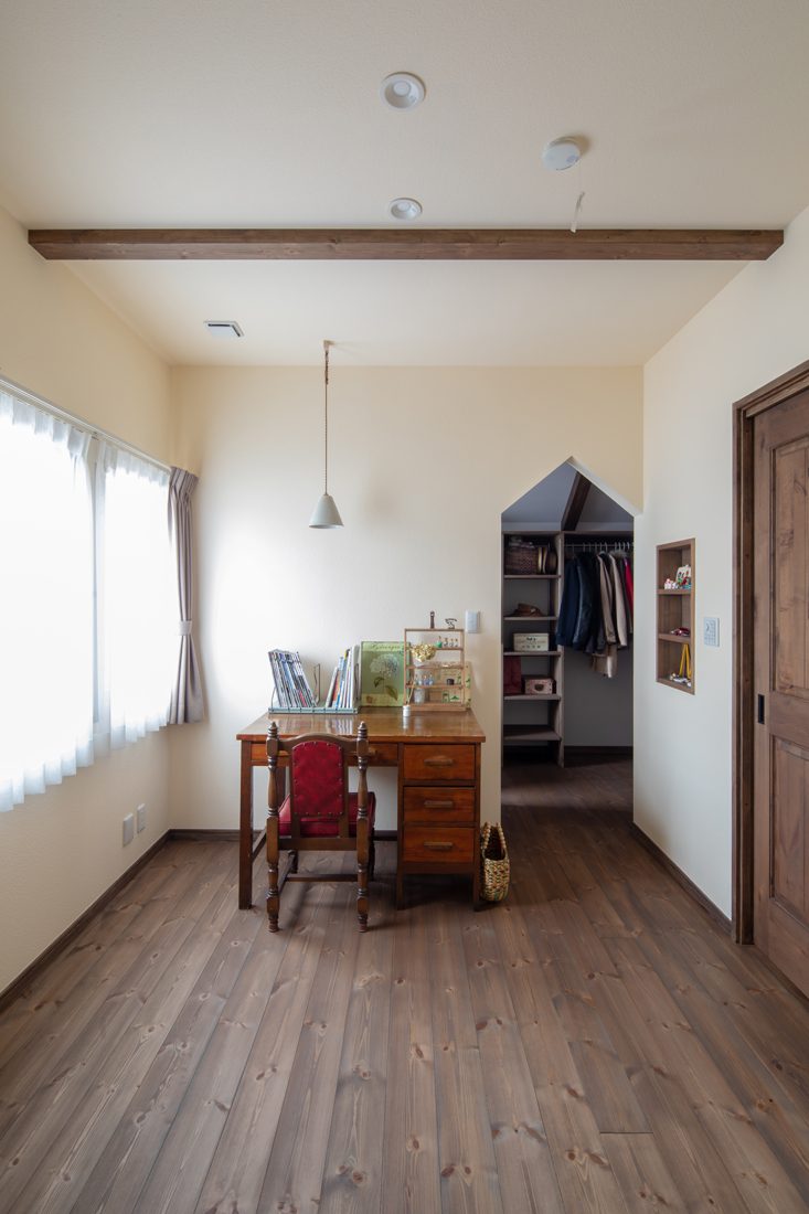 そして、趣味も反映させた。Mさんの趣味は釣り。釣ってきた魚をさばくために、キッチンとは別にオリジナルキッチンカウンターを造作。普段は、コーヒースタンドとしても活用されている。「家を建てたら、夫が家事をするようになって。朝、夫が入れてくれたコーヒーを飲みながらゆっくり過ごすのが楽しみ」とEさん。さらに、夫妻共通の趣味が雑貨店めぐり。家中のペンダントライトやランプシェード、フリースペースのスイッチプレートや畳コーナーのレトロ窓など、時には県外にまで足を運んで買いそろえたという。