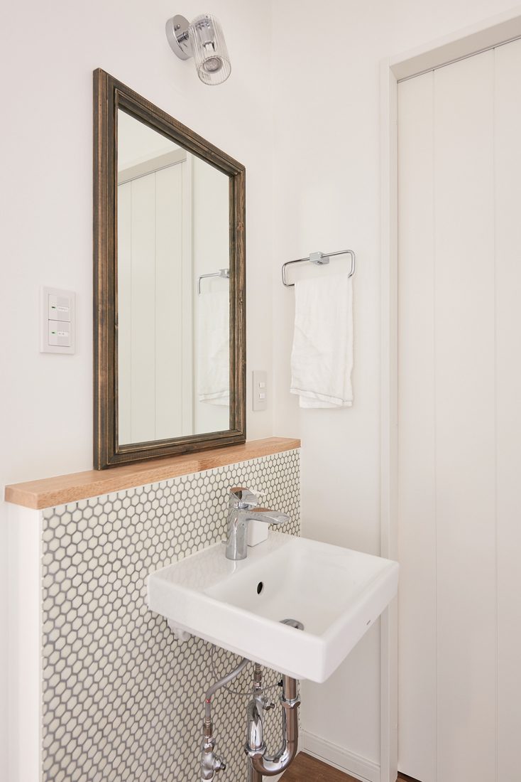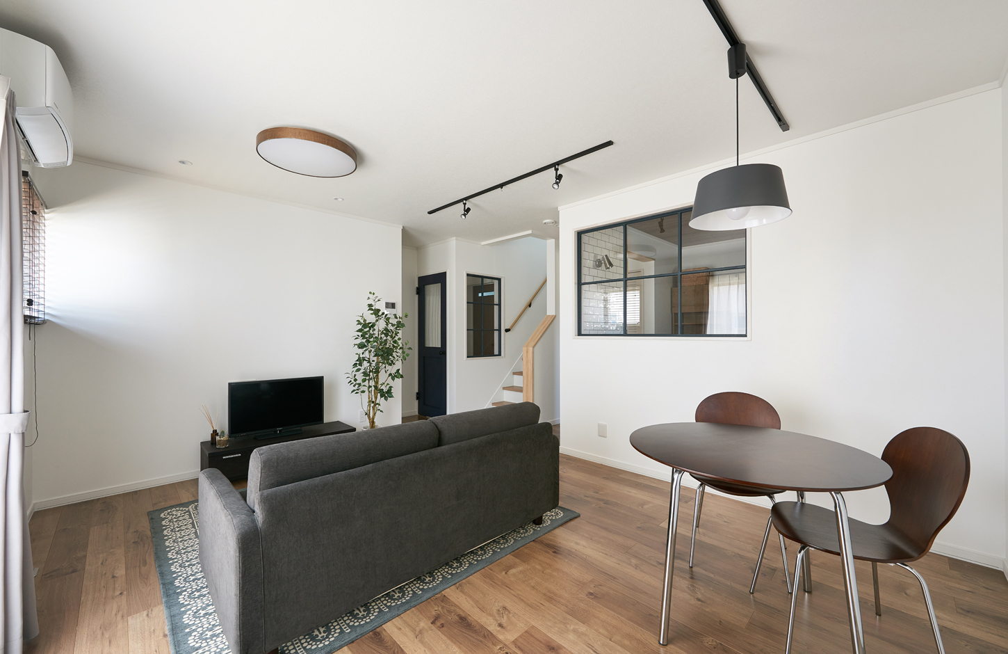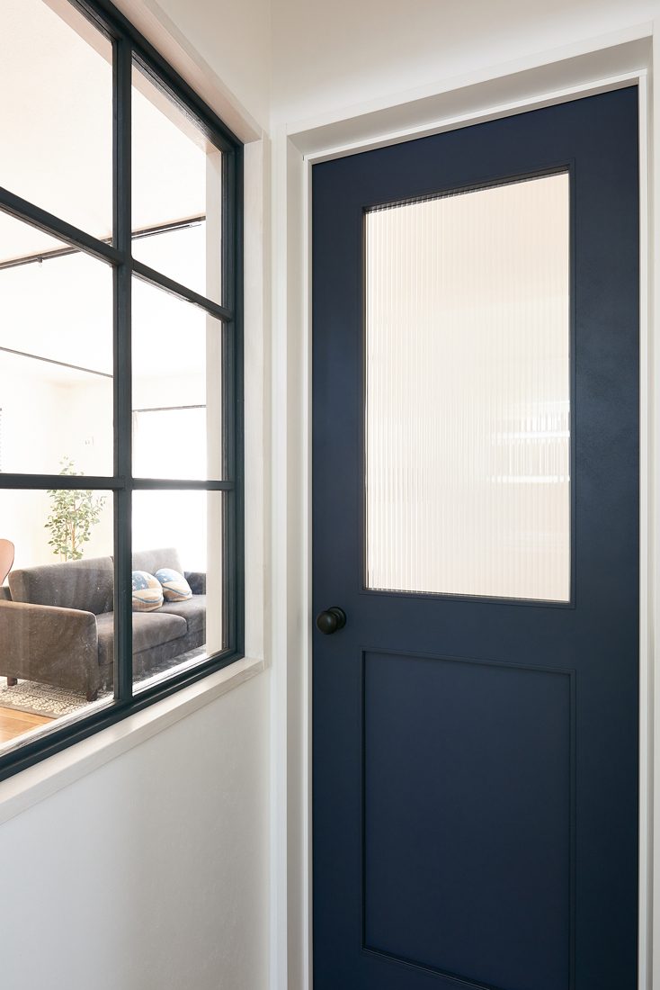 そして、T邸で印象的だったのがキーカラーの紺。キッチンとリビング、リビングと廊下・玄関をつなぐ格子窓、そしてリビングドアのカラーに採用した紺が、真っ白な壁や木目と相性がいい。「元々紺は好きな色でしたが、このリビングドアに惹かれて、他の建具も統一していった(Tさん)」そうだ。シンプルなデザインのなかにも、夫妻のセンスの良さが反映されていた。