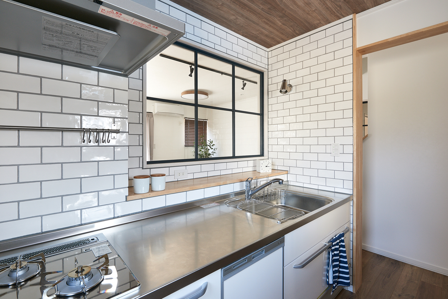 妻のEさんのこだわりはキッチン。「料理が好きなんですけど、キッチンの音や匂いがリビングに入るのは抵抗があって」とEさん。キッチンは独立させつつも格子窓を設置したことで、空間としてもつながりキッチンにもリビングにも開放感をもたらしている。
