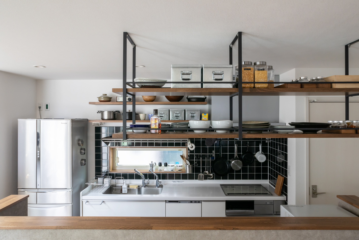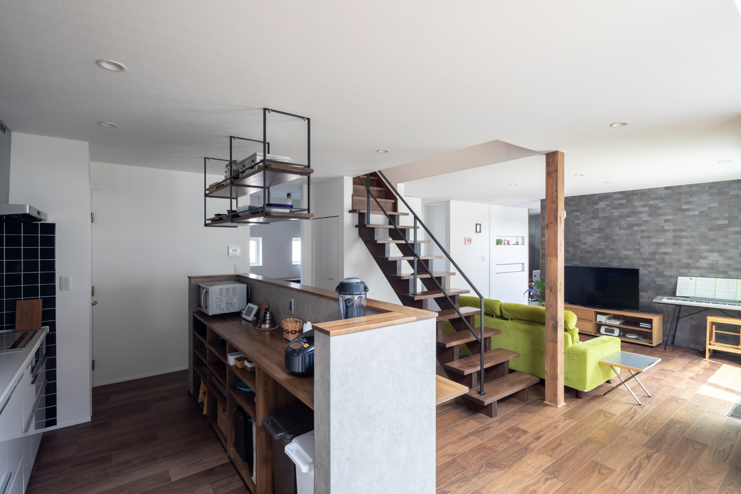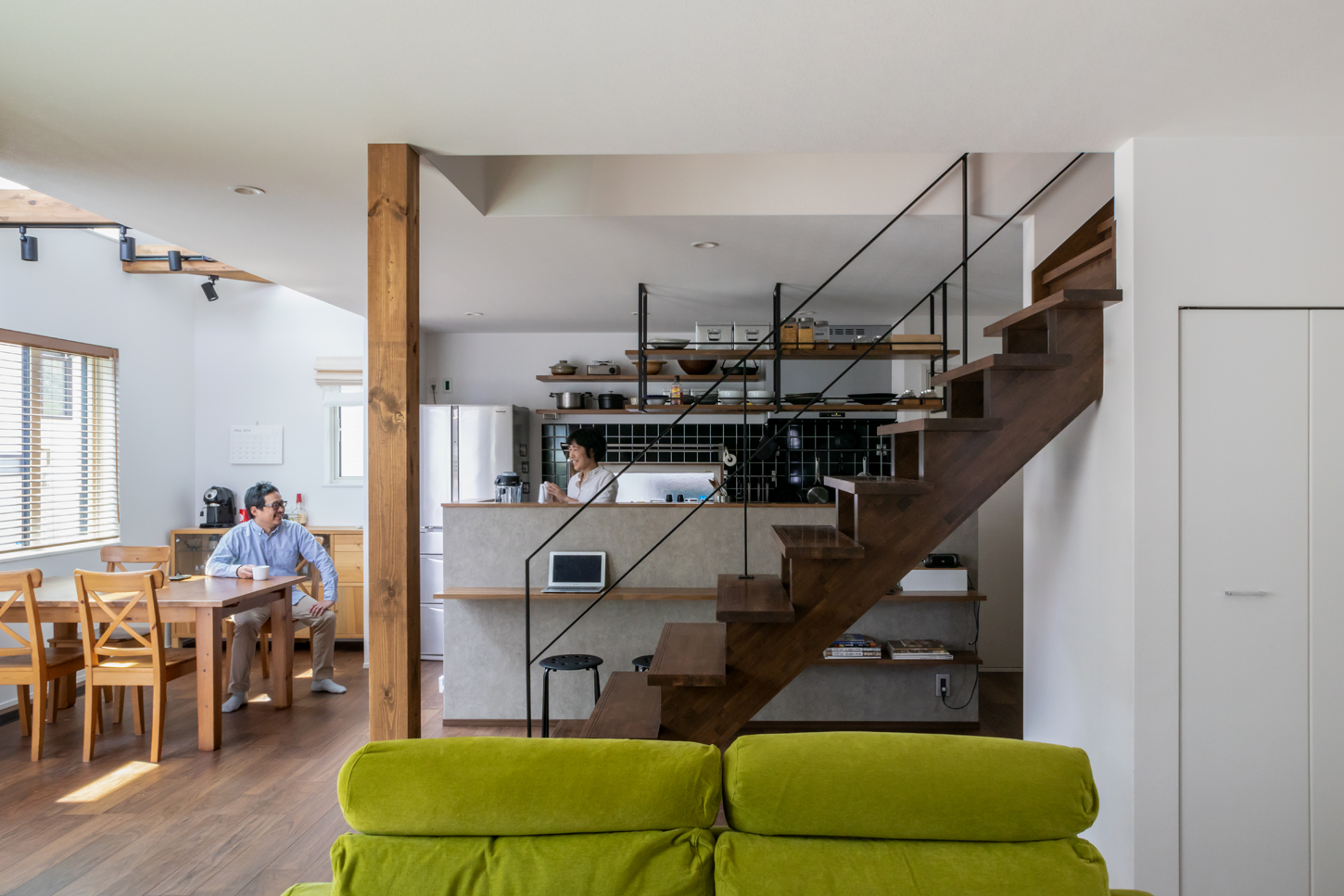 リビングダイニングの中心にレイアウトされたスケルトン階段が印象的なI邸。黒のタイルがあしらわれたスタイリッシュなキッチンのオープン収納も、まるでインテリア雑誌のディスプレイのようだが、「デザイン性も大切ですが、それよりも重要視したのは機能性です」と施主のIさん。オープンな収納はキッチンに立つときに一目で必要なものの所在がわかるようにという配慮から。1階の回遊動線は、帰宅してまっすぐ洗面台で手を洗い、脱衣所で着替えたり、シャワーを浴びてからダイニングに移動するという生活習慣を形にしたものだという。「こうした動線が可能になったのは、部屋中どこに行っても温度差がない、エアシス工法を選んだからだと思います」とIさんはいう。