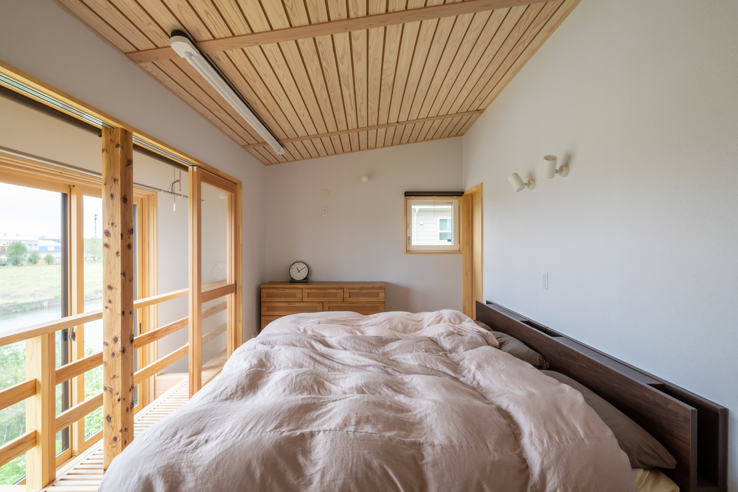 旧雄物川沿いの緑豊かな立地に、杉板張りウッドロングエコ塗装のソリッドな外観が映えるU邸。リビングから2階の寝室に向かって抜ける大窓からは川辺の景色から空の様子までが一望できる。