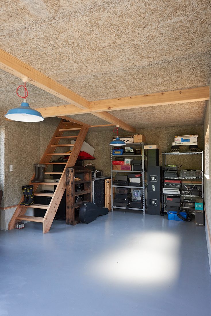 「木材をふんだんに使った切妻屋根の家がいい、というイメージは最初からありました。それに加えて私の趣味である車とオーディオ類がしまえるスペースが必要でした」と施主のKさん。母屋とは別にガレージ兼物置となる2階建の小屋を建てることと、1階のウォークインクローゼットなど収納スペースを確保することで、母屋はスッキリとした空間で暮らしを満喫できているという。