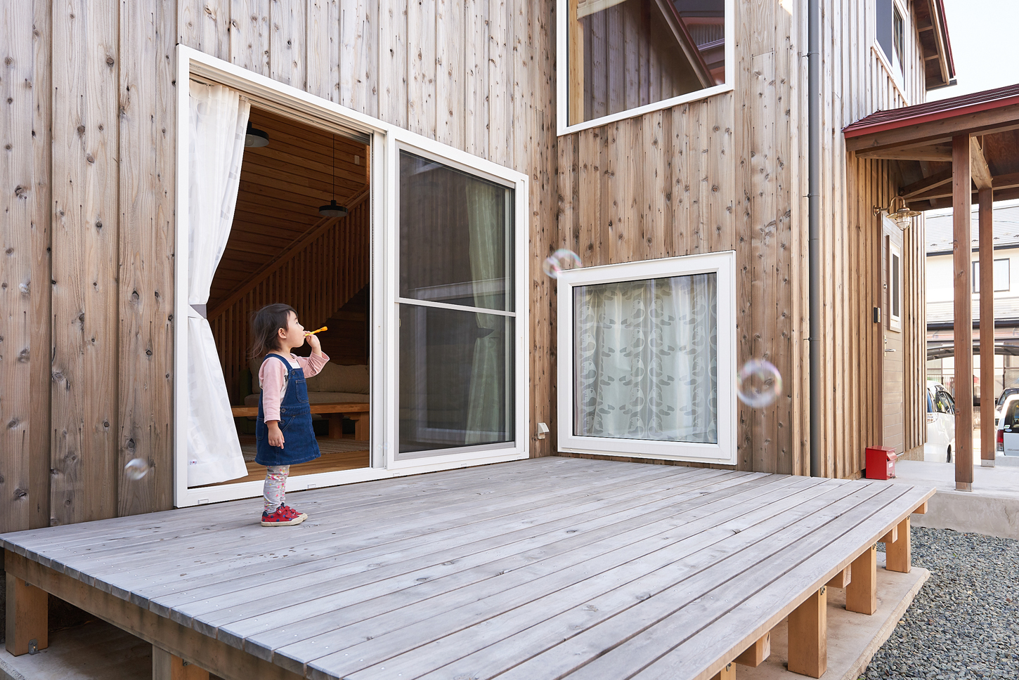 広々とした吹き抜けの大空間にLDKが安定感のあるK邸。天井勾配には天窓が切られ、さらにウッドデッキからリビングとホールへと光を導いている。「南側の隣家は接近した2階建てで、採光的には不利なため低層な東隣の家側にウッドデッキを設けることで採光を得る計画でした」と建築家の今井さん。