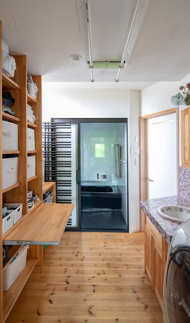 Sさんのこだわりは生活動線。キッチン、ランドリー、バスルームを直線で配置し、家事動線を最短に。また、Oさんは帰宅後、すぐに入浴する習慣なので、玄関ホールからもランドリーに直接入れ、リビングダイニングも含めて回遊動線でつながるように配置した。さらに、ランドリールームにはファミリークロークとしての機能も加え、洗濯、乾燥、収納が1か所で済む。そうした工夫が功を奏し、「家事の負担が少ない(Sさん)」そうだ。