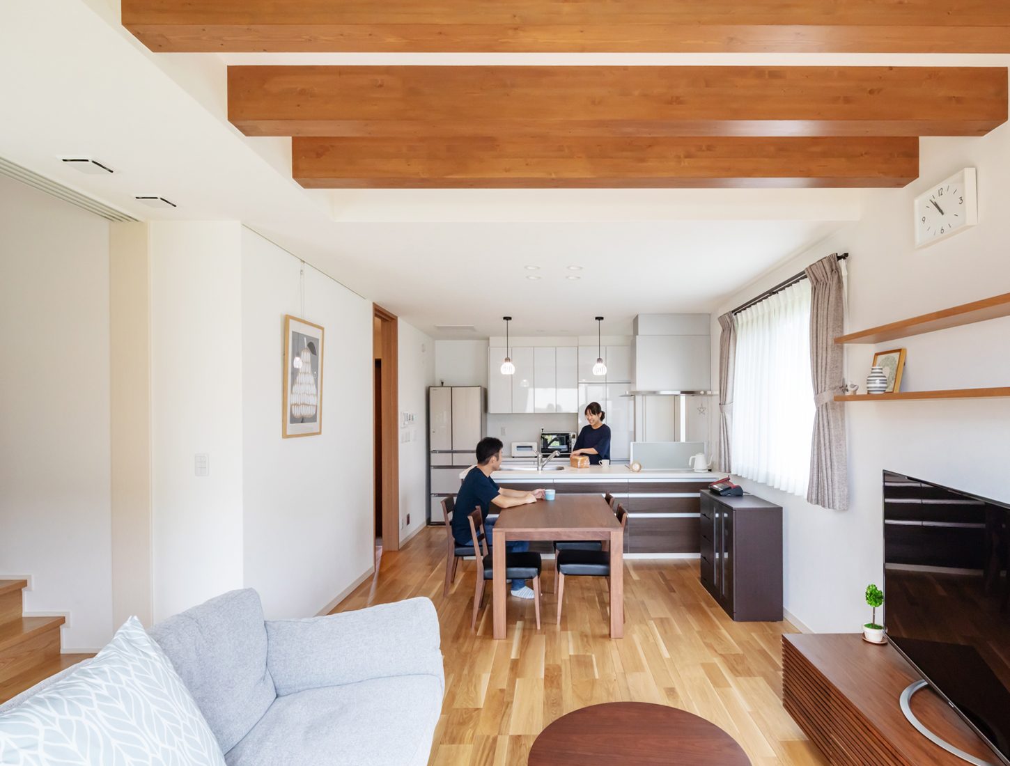 家を建てるなら木造の雰囲気をしっかり感じられる家に住みたいと思っていたというNさん。梁や構造を現しにするシャーウッドの「ウッディスケルトン」のダイナミックで温もりのあるデザインも気に入ったポイントだった。「天井の半現しの梁や床のフローリングにもナラの無垢材など、モデルハウスを見て気に入った要素はできるだけ盛り込みました」とNさん。妻のAさんは「最終的に第一印象に素直に従った結果になりました。営業のご担当の荒さんの印象もとても良くて、家を建てた後もお付き合いを続けています。ほかの人だったら違う結果だったかもしれません。家づくりは人との出会いでもありますね」と家づくりを振り返る。