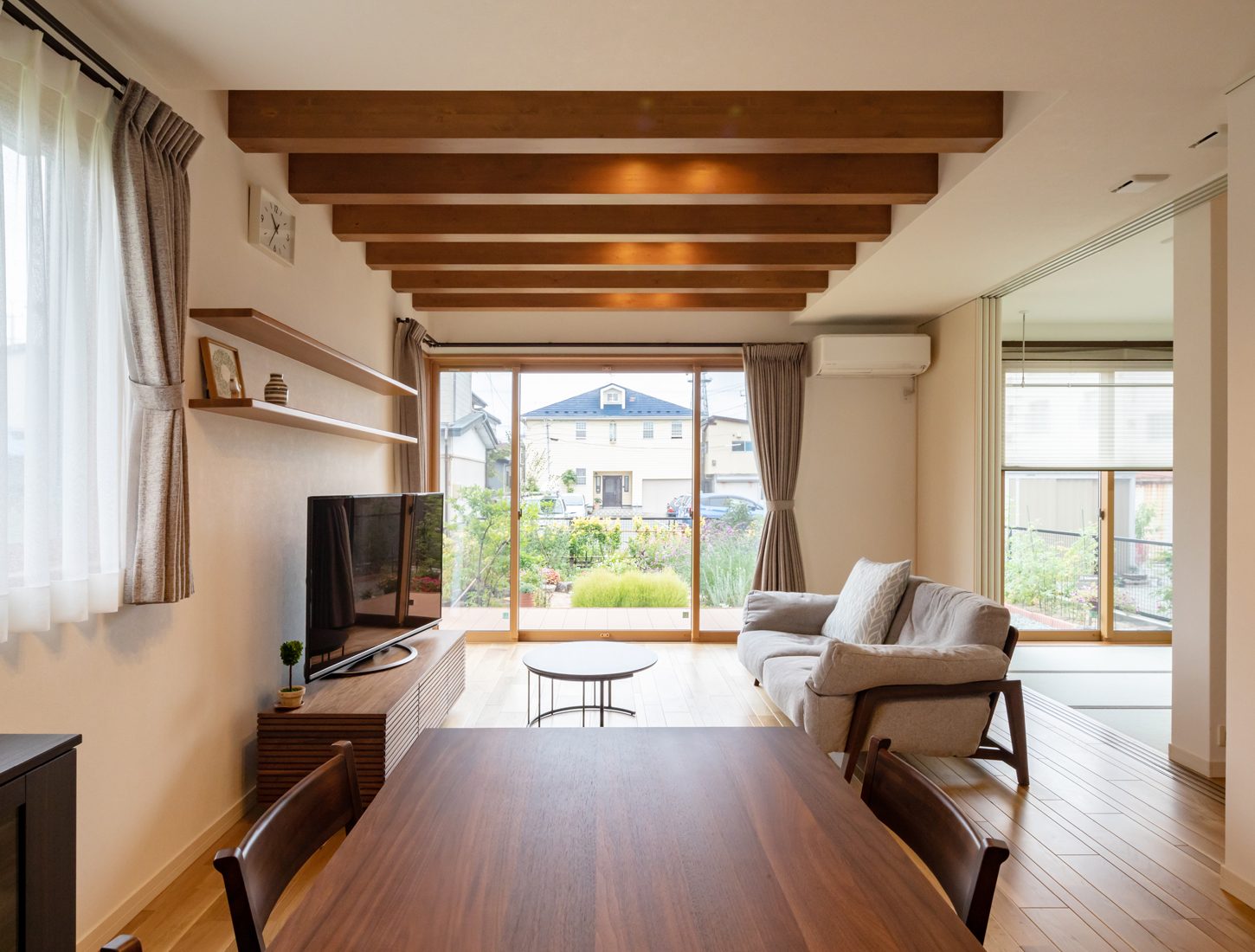 南面の大窓とつながるコーナー窓、ハイドアで統一された室内ドアにより、ひときわ明るく開放感のある空間を実現したN邸。リビングに面したハイサッシからはNさん夫妻が丹精込めて手入れをしてきた庭を眺めることができる。