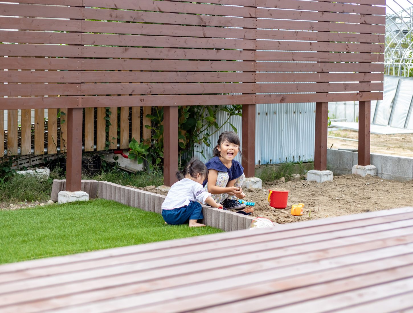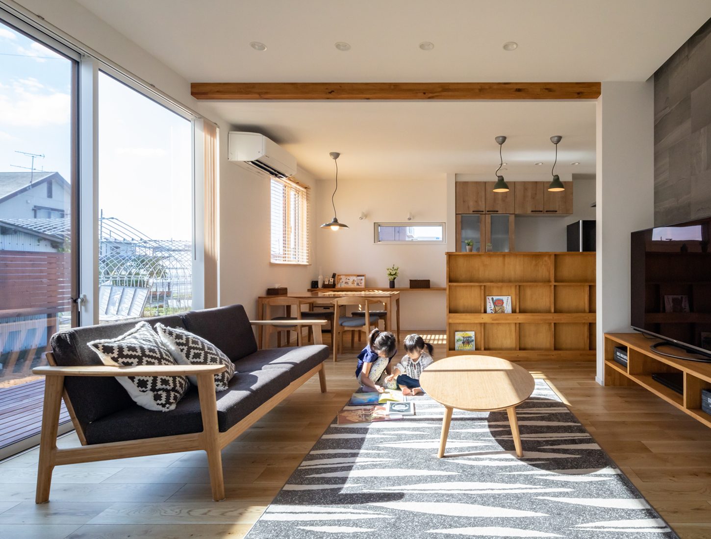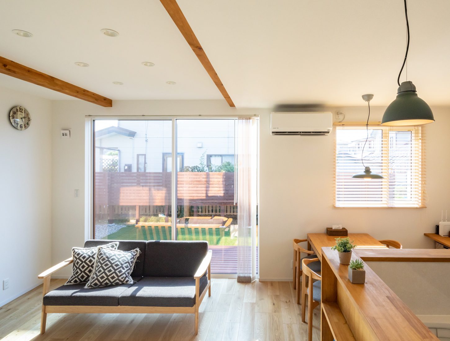 ハイサッシから光がさんさんと差し込む明るいリビング。広めのウッドデッキが庭と室内をつなぐ。釣りとバーベキューが趣味という施主のSさんが家族と過ごすひとときを充実したものにするために、強く希望した空間だった。手先の器用なSさんは念願のウッドデッキと、庭のウッドフェンスをDIYで仕上げ、思い入れもひとしおだとか。「普段子どもたちが庭で遊ぶのにもちょうどよくて、重宝しています」と妻のYさんも微笑む。