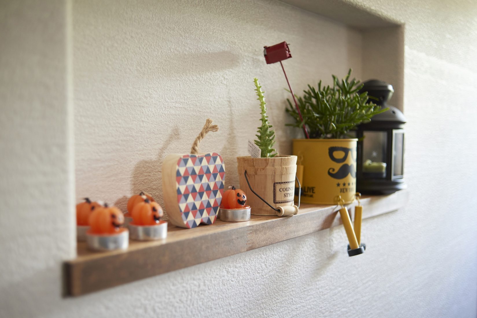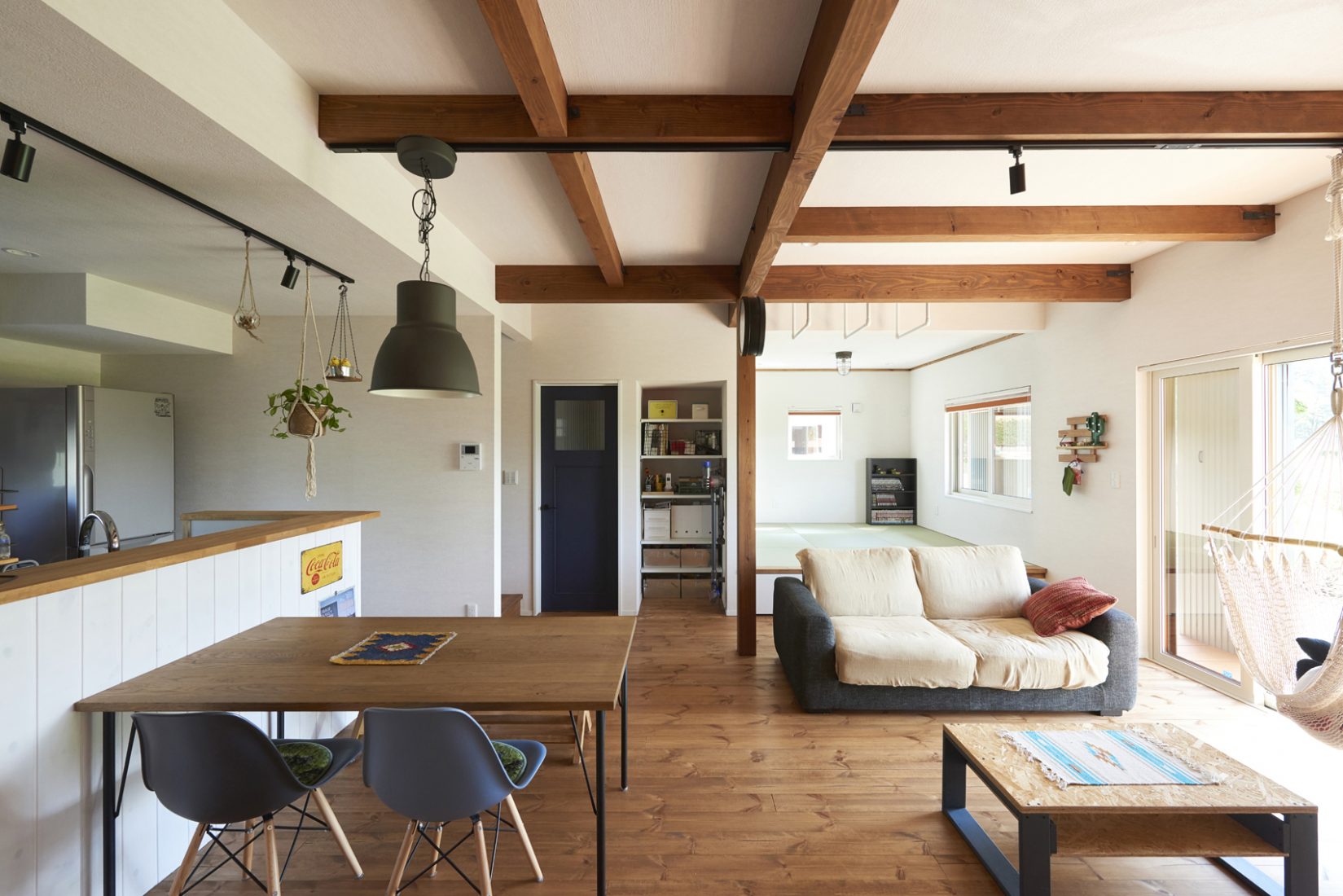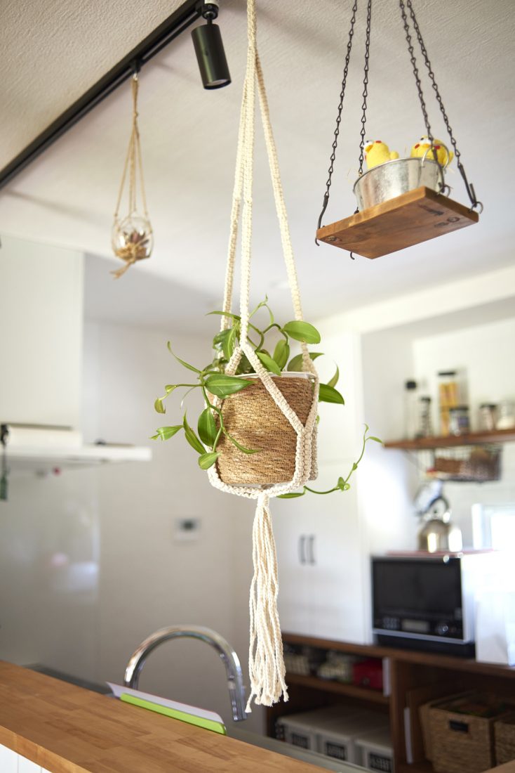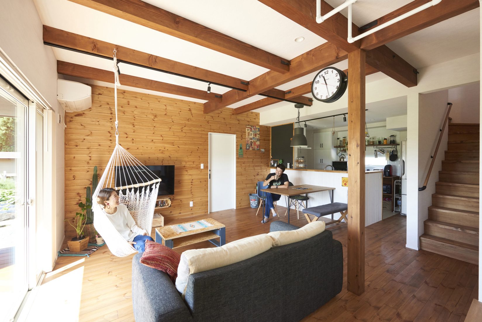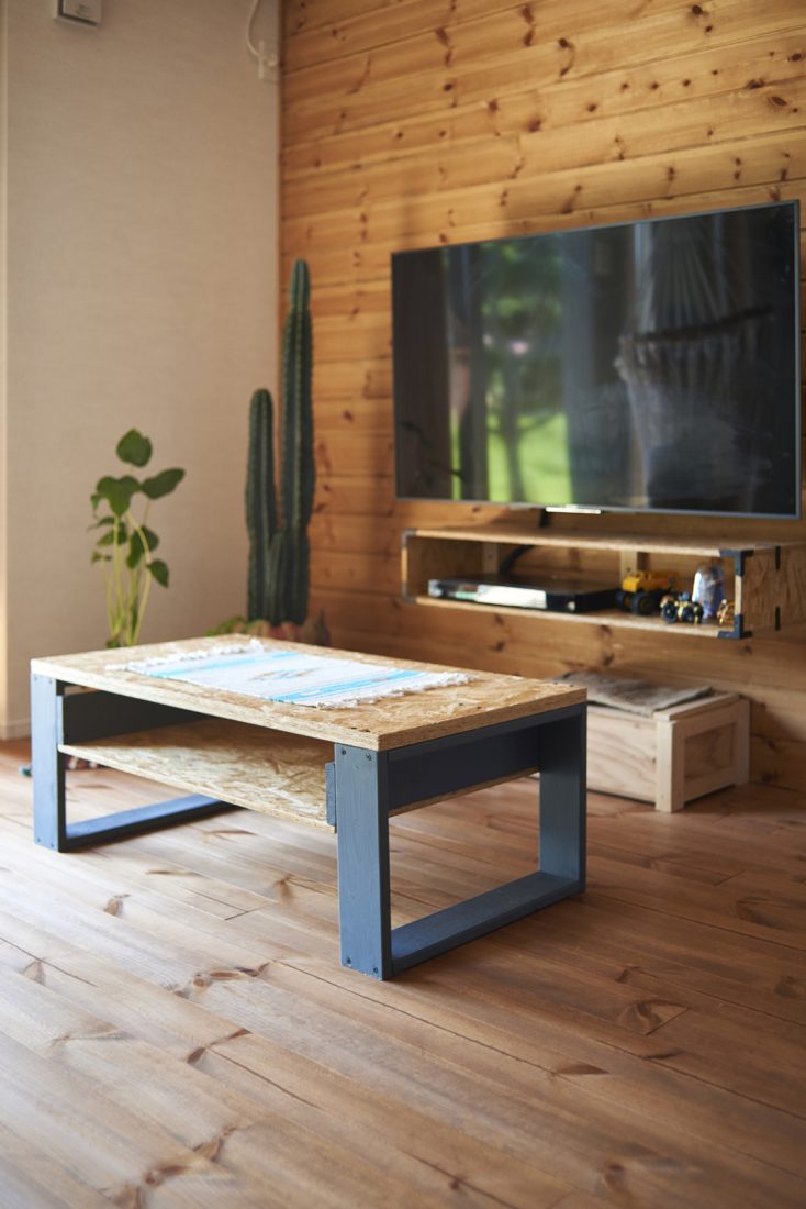家づくりはSさんが主導。「木に囲まれて暮らしたい」と床は無垢のレッドパイン、梁も現しにして、建築中には、クロスの予定だった壁の一面を板張りに変更した。木目と白壁の相性が良く、観葉植物の緑も手伝ってカフェのような室内に仕上がっている。そして、特筆すべきはDIY。ダイニングテーブルやテレビボードなどはSさんの手作りだ。「もともと好きでしたけど、アパート当時はやっても仕方ないなと思っていました。ホワイトボックスの内覧会でOSBボードの壁の家があって、その質感が好きで、これを材料に何か作りたいなと」とSさん。これからも、パソコンデスクやピザ釜をDIY予定だそうだ。
