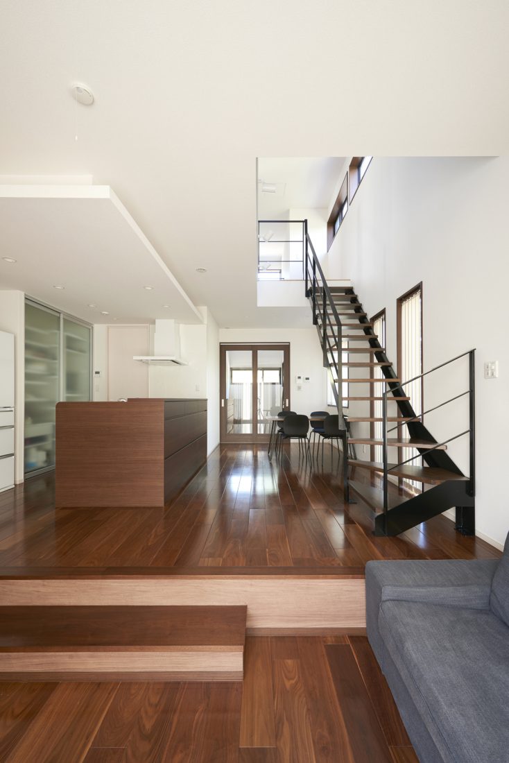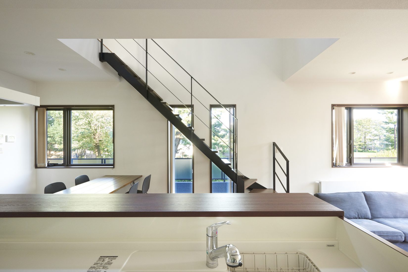 開放的な家づくりへのこだわりは立地にまで。高台の傾斜地に建てたI邸は、敷地が道路から1メートル以上高くなっているため、外からの視線が入らず、室内だけでなく外に対しても開放的に暮らすことができる。キッチンに立つと、公園の木々の緑、2階フリースペースからは、遮るものなく太平山まで見通せるという。