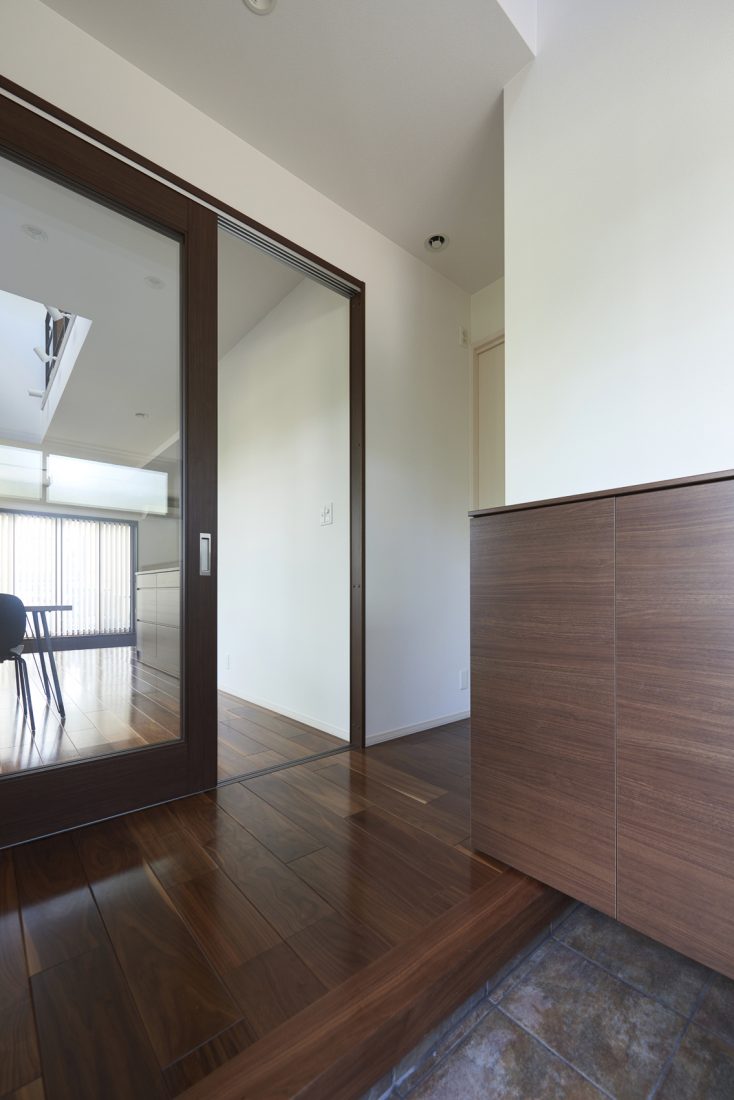 吹き抜けの開放的な玄関。室内に目を向けると、あえて透明のガラスにしたリビング引き戸の向こうに、ダイニングキッチン、リビング、その奥にある庭までが見通せる。