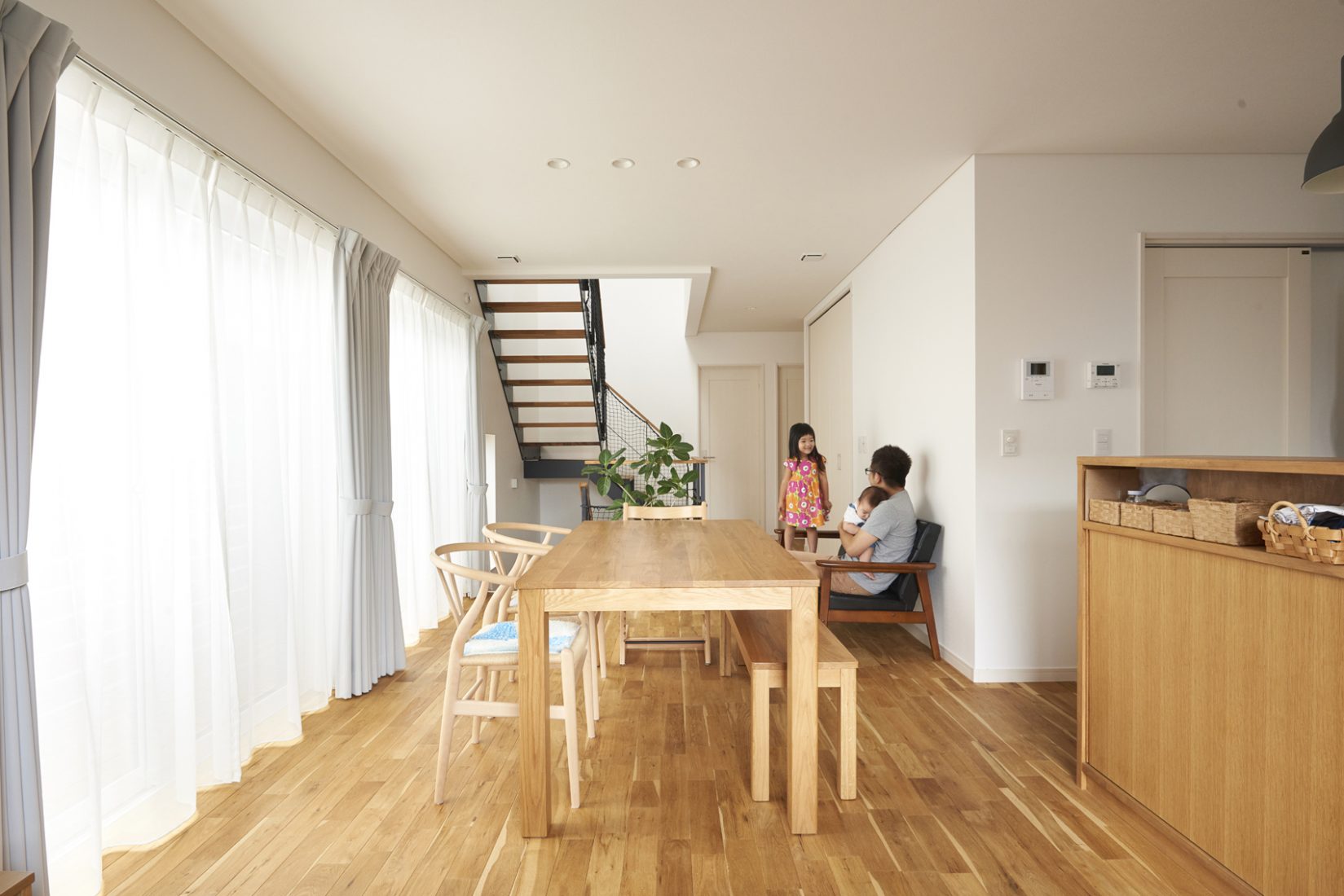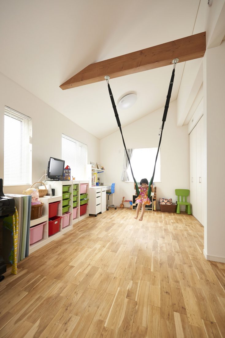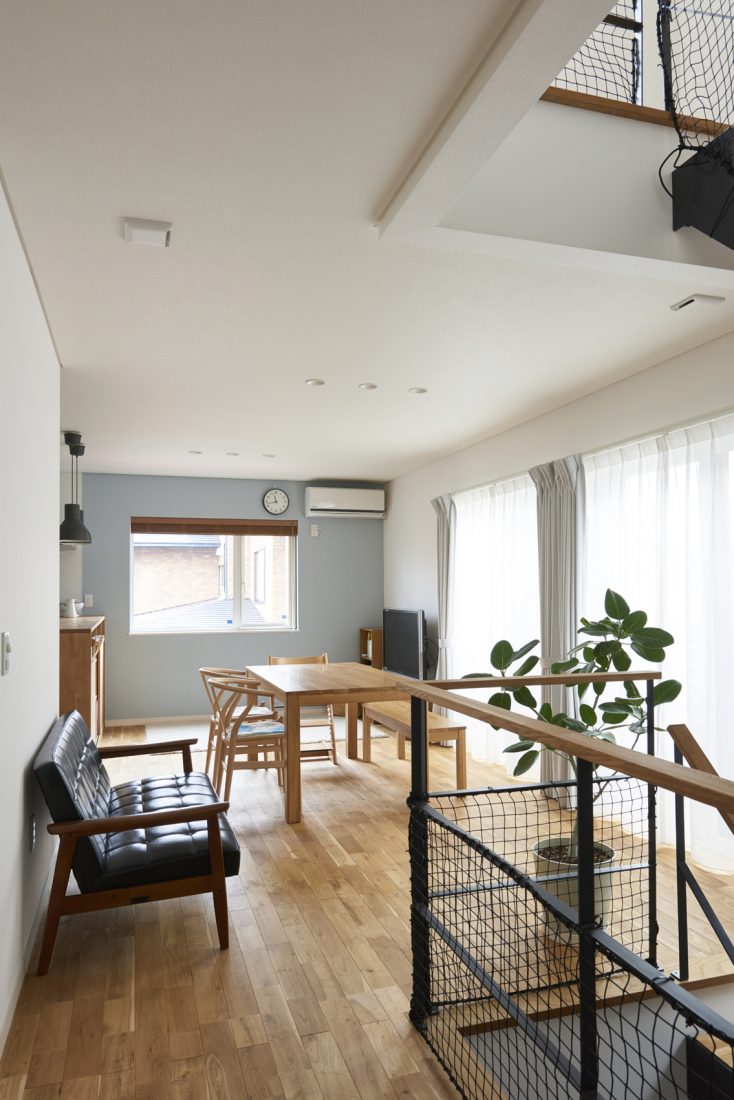 妻のKさんが特に希望したのが、フロアをつなぐ吹き抜けの階段だった。「空間のアクセントにもなるし開放感も出るので、この階段がほしいとお話ししていました。秋田のような寒冷地では、避けられがちなレイアウトですが、ドリームビルドさんの断熱性能の高さはモデルハウスでも実感していたので、ぜひお願いしますと。ひと冬越してみて、冬も快適。このレイアウトでは珍しいのでは」とKさん。