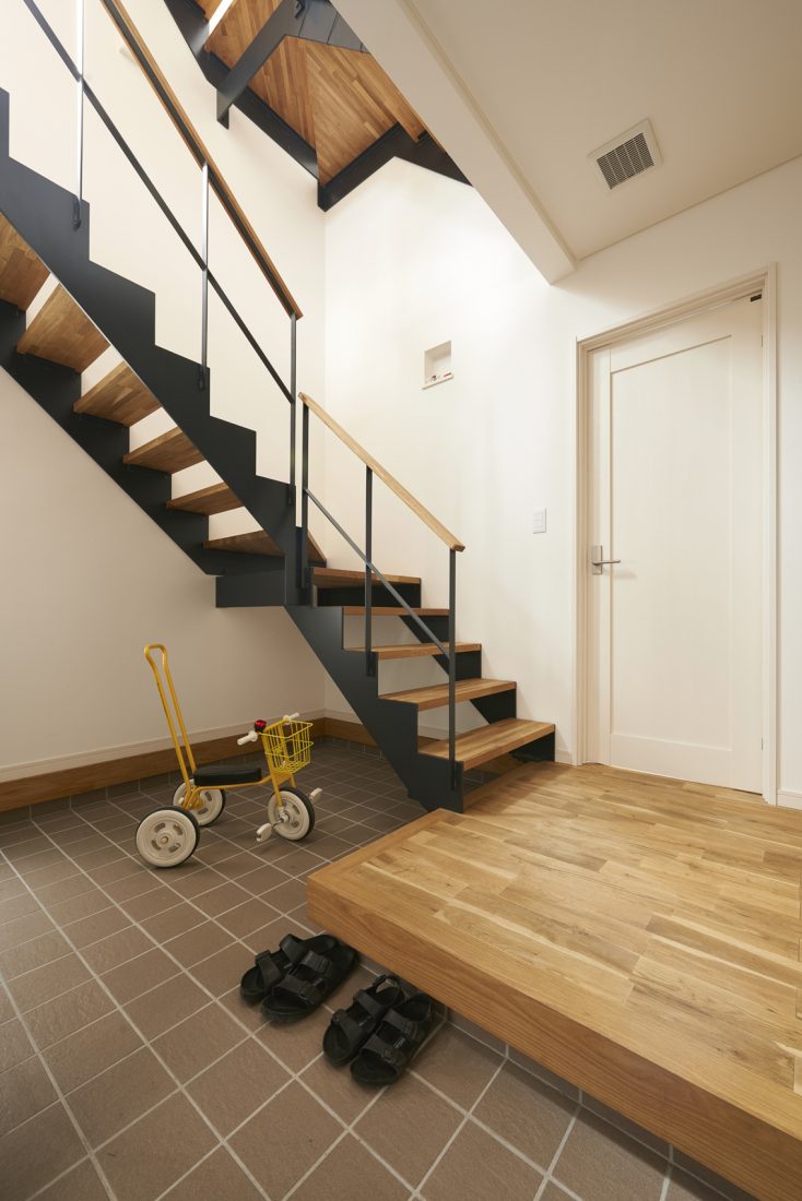 吹き抜け階段を生かした 開放感のある自然素材の家