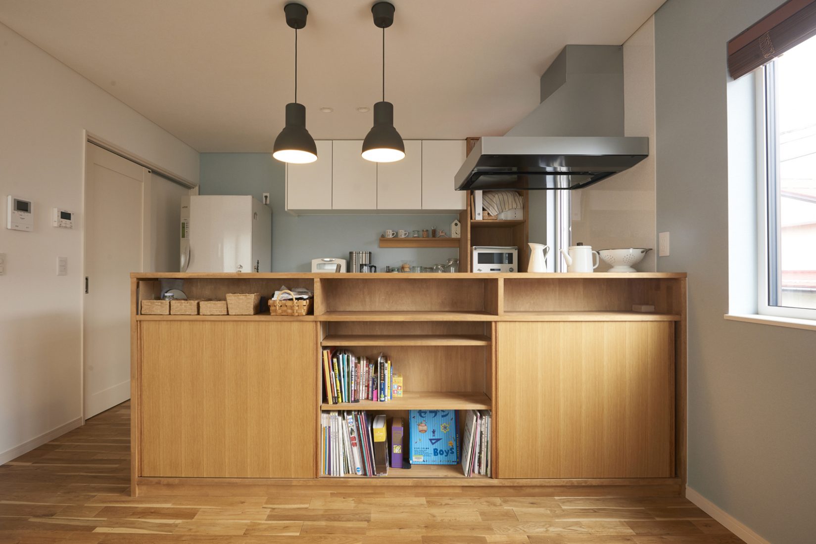 内覧会で見た家のデザインや、無垢材など自然素材をふんだんに使用している点、1階に2台分入るガレージと2階リビングというレイアウトなどが気に入り、ドリームビルドでの家づくりをスタートした。「中心部を希望していたので、ちょうどいい土地がなかなか出ず、ようやく出てきた土地が39坪だったので、『ここに家が建ちますか……?』というところから相談しました」と笑うTさん。面積的な広さこそ抑えたものの、吹き抜け階段の開放感が空間を広く感じさせるのに一役も二役も買っている。往来の人と視線が合いにくく、採光もたっぷりの2階リビングは、住宅が立て込む中心地で本領発揮しているそう。「どんな季節も明るくて、家で過ごす時間が気持ちがいいんです」とKさんもいう。