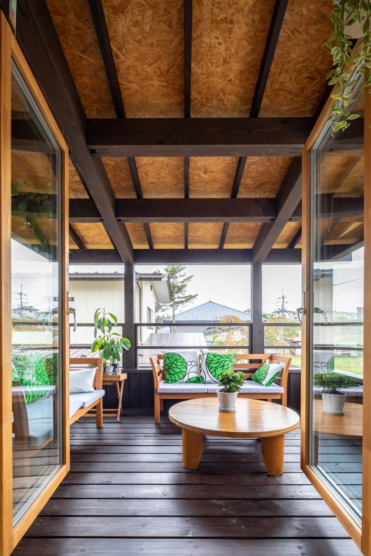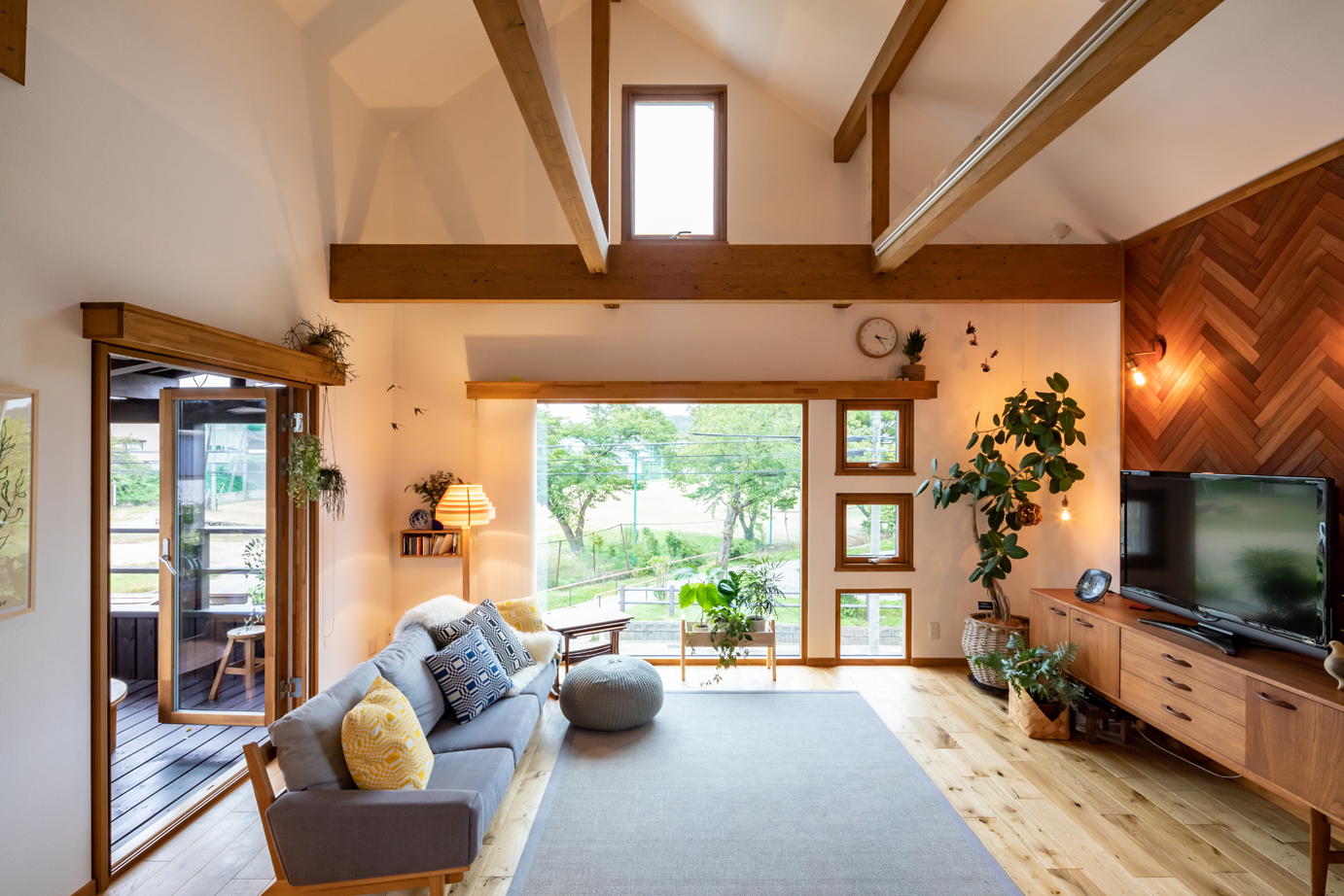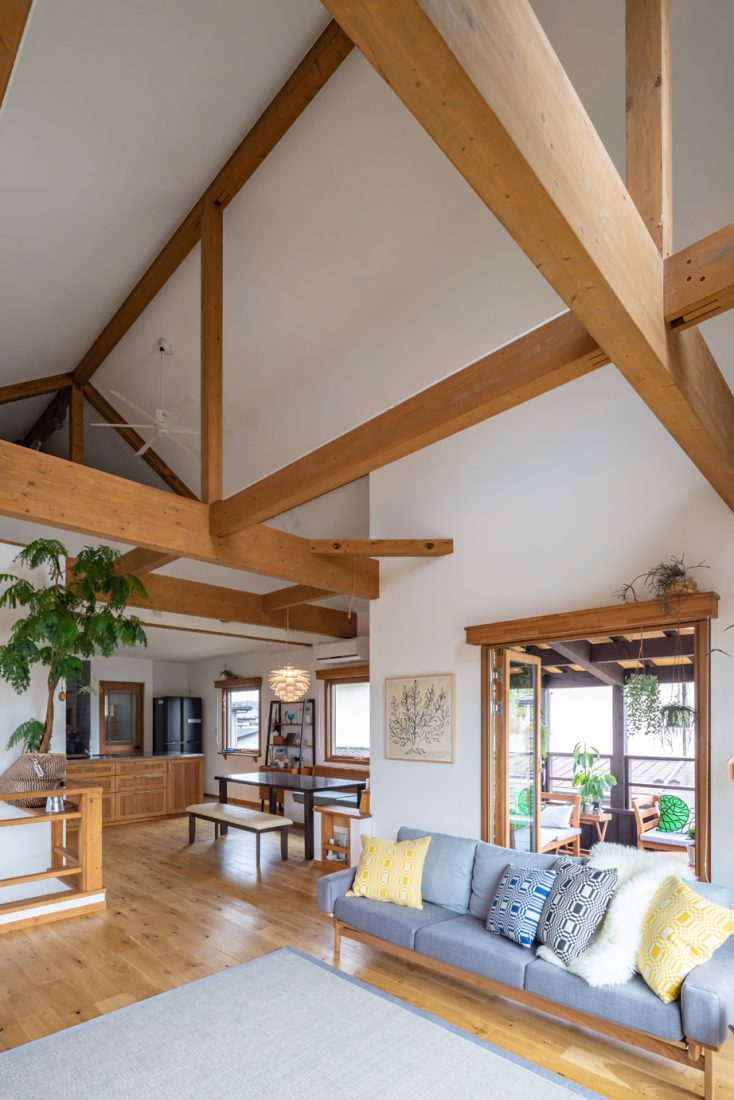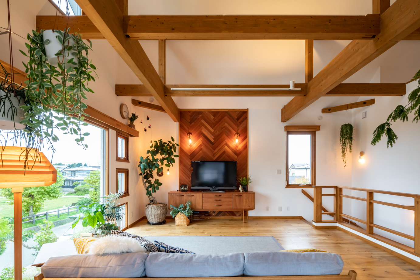 通りに面した2階のリビングの大窓から見える公園の緑が目に鮮やかなH邸。梁を現しにした吹き抜け天井の開放感が抜群だ。リビングに面したウッドバルコニーには屋根を掛け、一つの部屋として使える空間になっており、外での飲食やセカンドリビングとしてなど、多様な過ごし方を受け止める空間になっている。オークのフローリングや木製トリプルサッシ、マホガニーをヘリンボーン柄に張った壁など自然素材がふんだんに使われた室内は、妻のMさんの趣味である観葉植物がとてもよく映える。