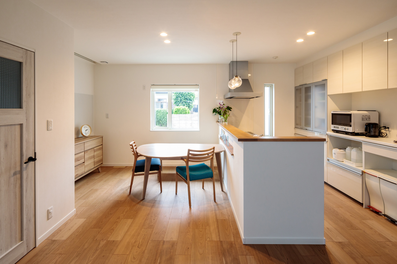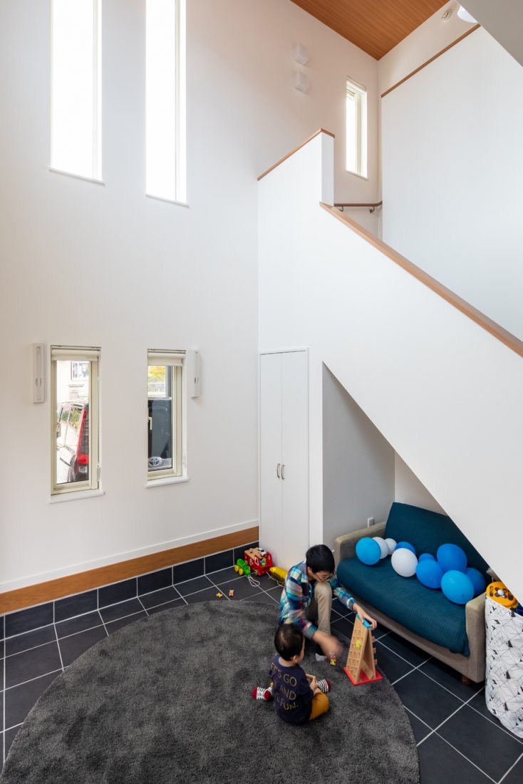 この土間は、住まい手のライフスタイルによって自由に使えるメリットがある。「こういう特定の役割のない空間がほしかったんです」と話すNさんの言葉どおり、子どもも大人も多様な過ごし方が考えられるスペースだ。また、上部が吹き抜けになっていることで明るく開放的な室内に仕上がったのも、土間という自由な空間を「使いたい」と思わせるのに一役買っている。