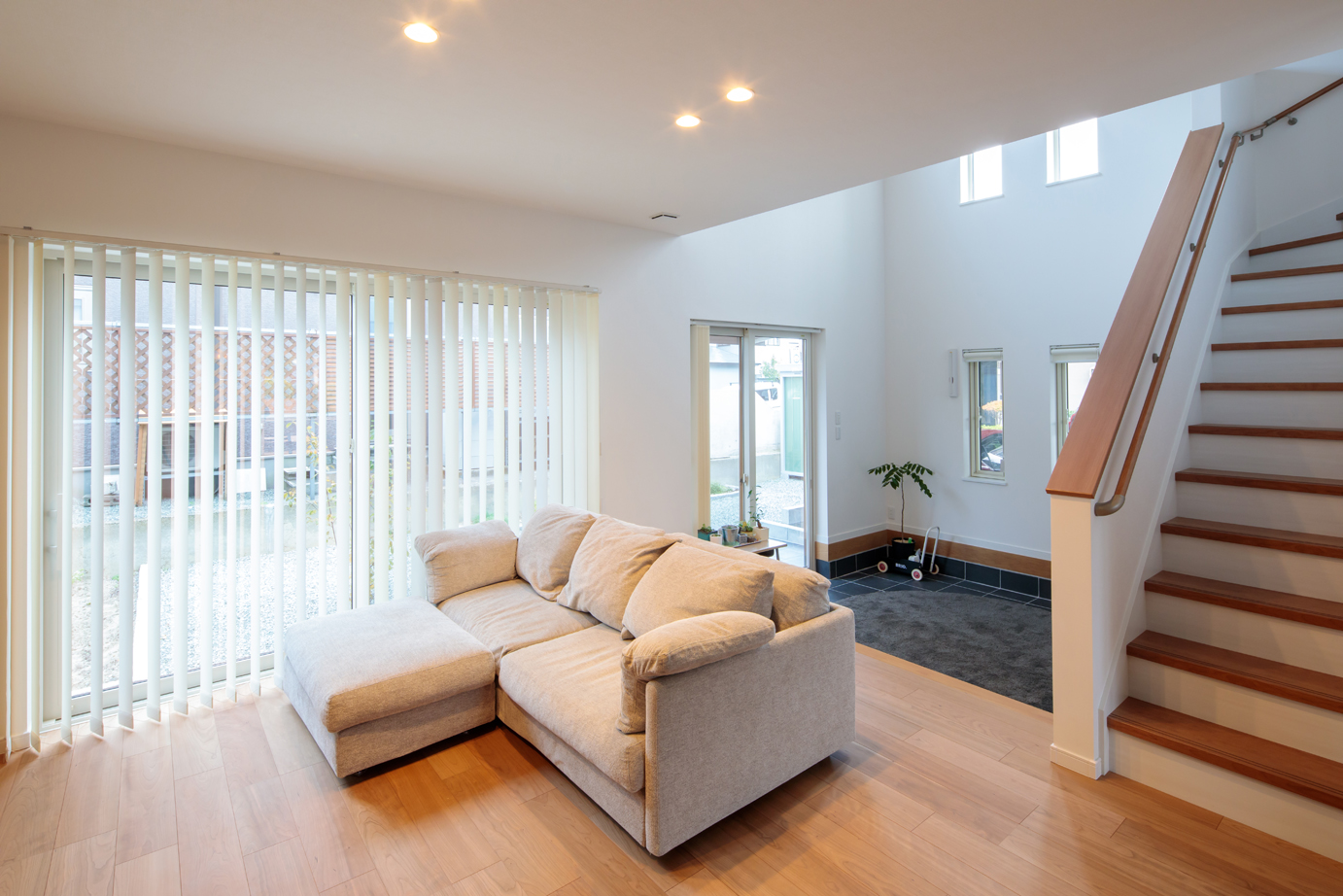 選んだのは三光不動産の「+Commit」というセミオーダーメイド住宅。そのうちストーブライフというモデルがまさに内と外をつなぐ土間空間のあるものだった。「子どもが泥だらけになってもここで一旦泥を落とせるし、庭でバーベキューをやってもいい。冬の間はこの土間を遊び場にすることだってできます。最終的に我が家では薪ストーブは採用しませんでしたが、それでもこのモデルは庭や外部空間を楽しみたい人にはぴったりのプランだと思います」とNさんはいう。