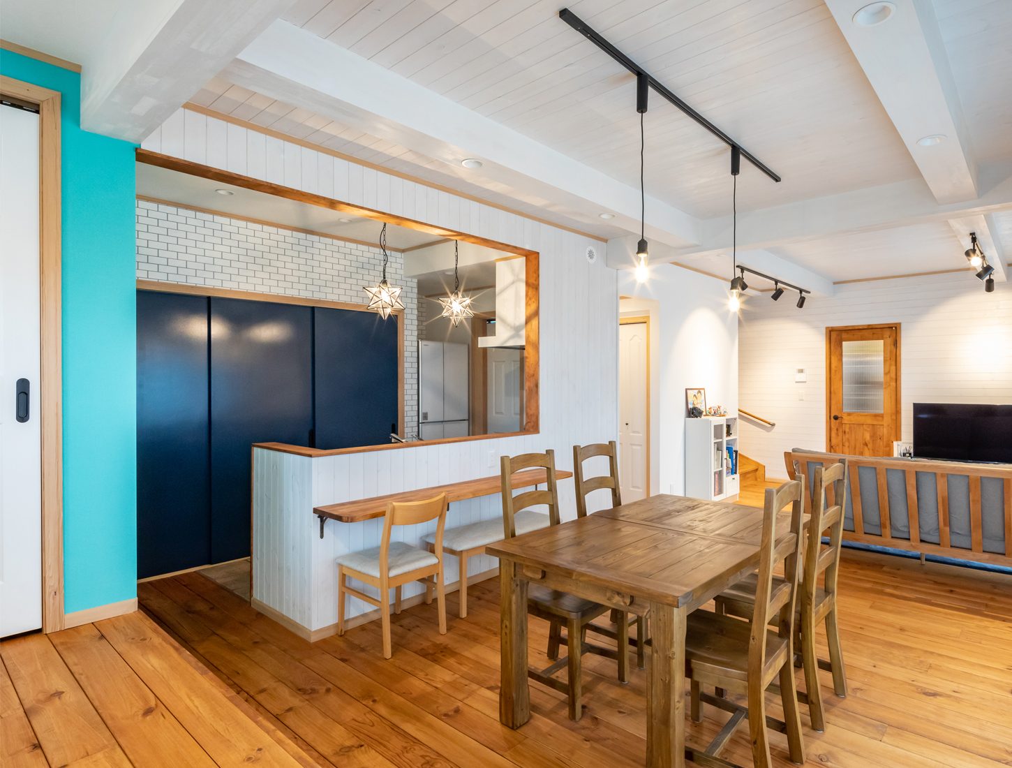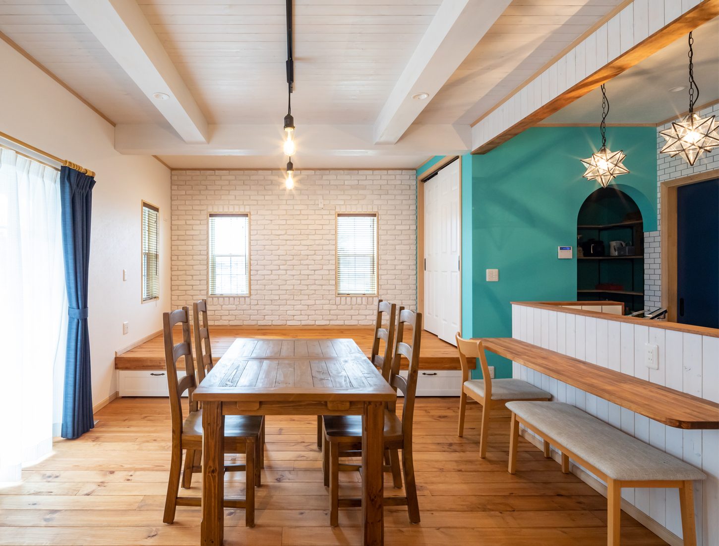 開放的な間取りにしたいと、1階はほとんど仕切りのないオープンな空間になっているK邸。印象的なのはリビングの小上がりだ。畳敷きのタイプが一般的だが、家全体のデザインテイストに合わせてボルドーパインのフローリングを採用するなど、柔軟な考えで空間をデザインしている。「小上がりは将来子育てするときにも何かと便利だと聞くので、ぜひにとお願いしました」と妻のSさんは話す。