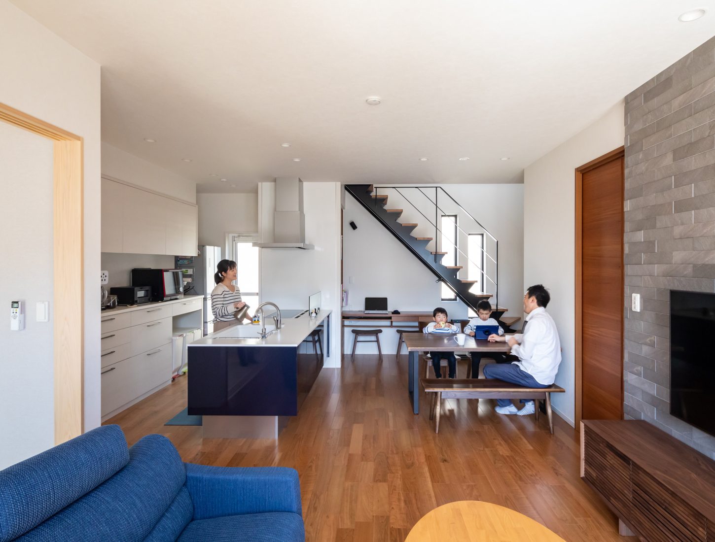 仕切りのない大空間とキッチンから 家族の会話が生まれる家