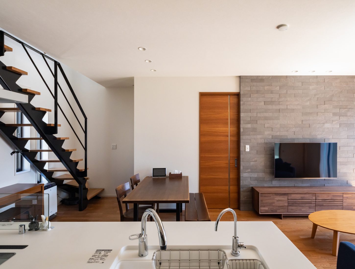 天井の高さが抜群の開放感を感じさせるS邸。通常の天井高より約320ミリメートル高くすることで、空間の広がりを生み出している。リビングに配置したスケルトン階段が空間のアクセントにもなっている。