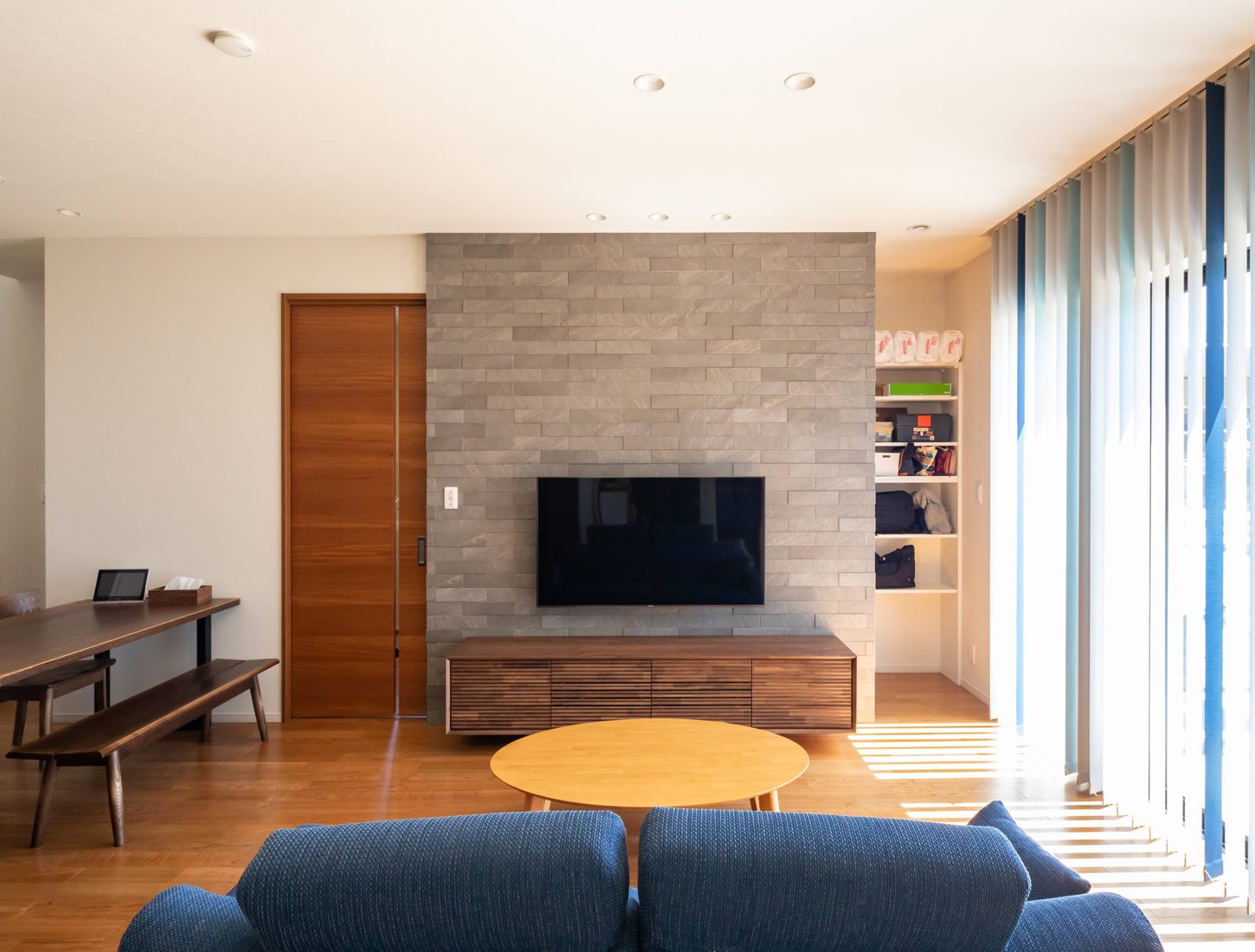 スキー、登山、バーベキューと多趣味なSさん。「玄関土間はスキー板などのメンテナンスのためにぜひほしいとお願いしました」と話す。このほかにも家族でスキーや登山に出るためのギアを収納するために庭には倉庫を設置したり、リビングのテレビ台の後ろに仕切りのない収納スペースをつくるなど、すっきりとした空間が無理なく続く細やかな工夫がなされている。