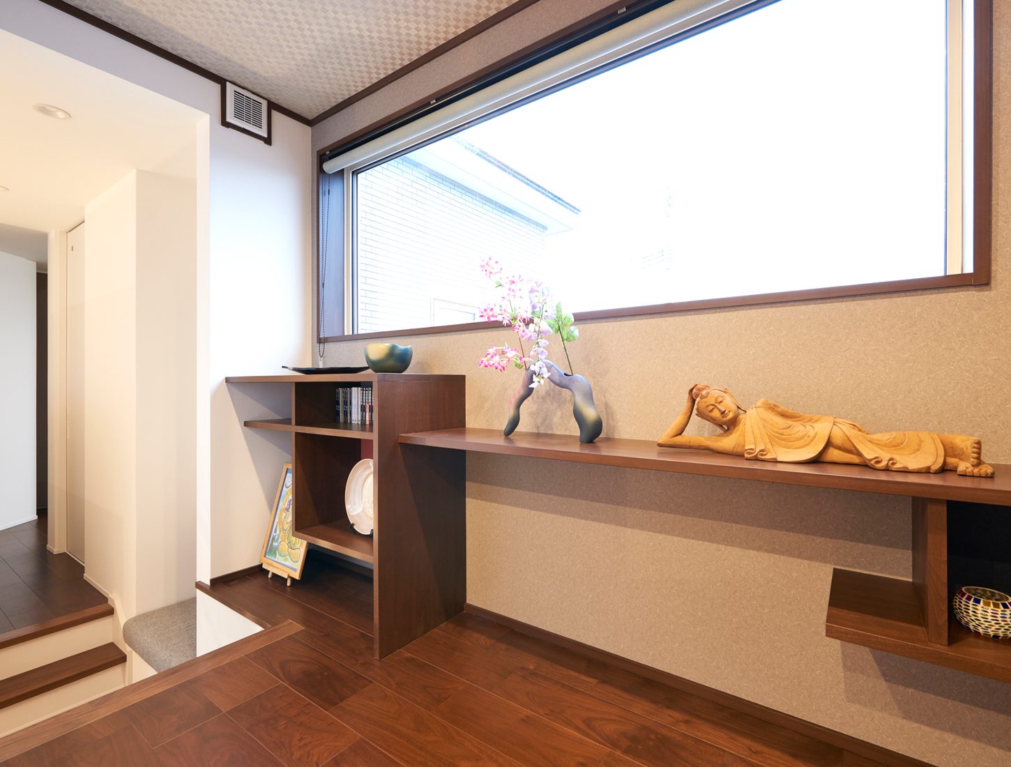 開放的な吹抜け、視線の抜けを生み出す窓やスリットの配置、あえて壁を作らず柔らかく空間を仕切る飾り棚。「この家を見たとき、思わずときめいてしまって」というIさんの気持ちもよくわかる、モダンな住宅はサンコーホームのモデルハウスだ。