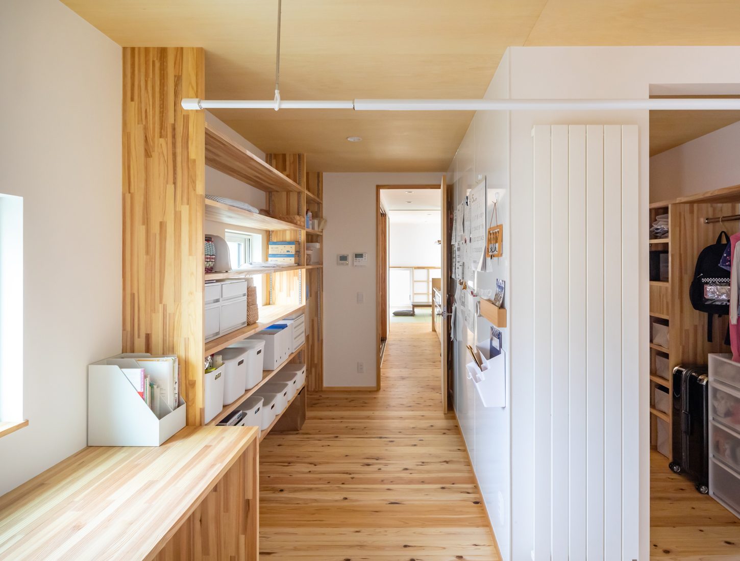 家づくりでは間取りに時間をかけたという。「将来的なことを考えて主寝室を1階に。自分が面倒くさがりということもあって、家事動線をどう効率化するのかを考えました」とNさん。結果、家の中心に大きなファミリークロークを配置。それを囲むように、LDK、家事室を兼ねたパントリー、水回り、主寝室が配置され、回遊動線でつながっている。「洗濯したらそこに干して、そこにしまう。旅行の準備も1か所で済むし、快適で言うことなし」とHさんも大満足だ。