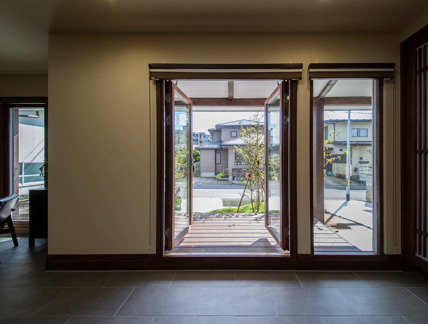 「はじめは、広告の外観写真に惹かれました」とTさん。正面の三角屋根を中心にしたシンメトリーな家の形、真っ白な壁とウォルナット色の柱や木製サッシ、ウッドデッキの落ち着いたコントラスト。それらのすべてが、「漠然としたイメージに対する答えのようだった(Tさん)」そうだ。
