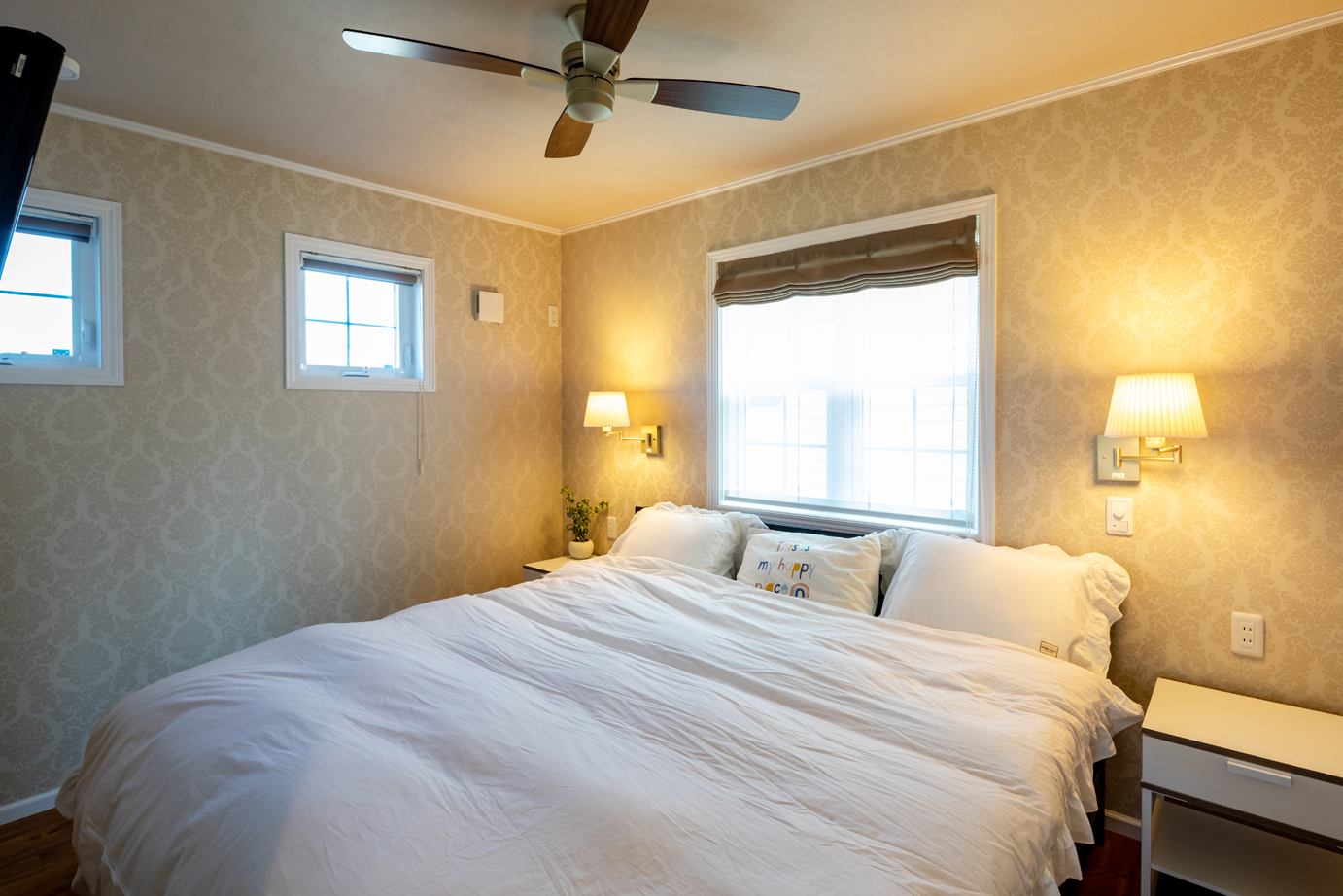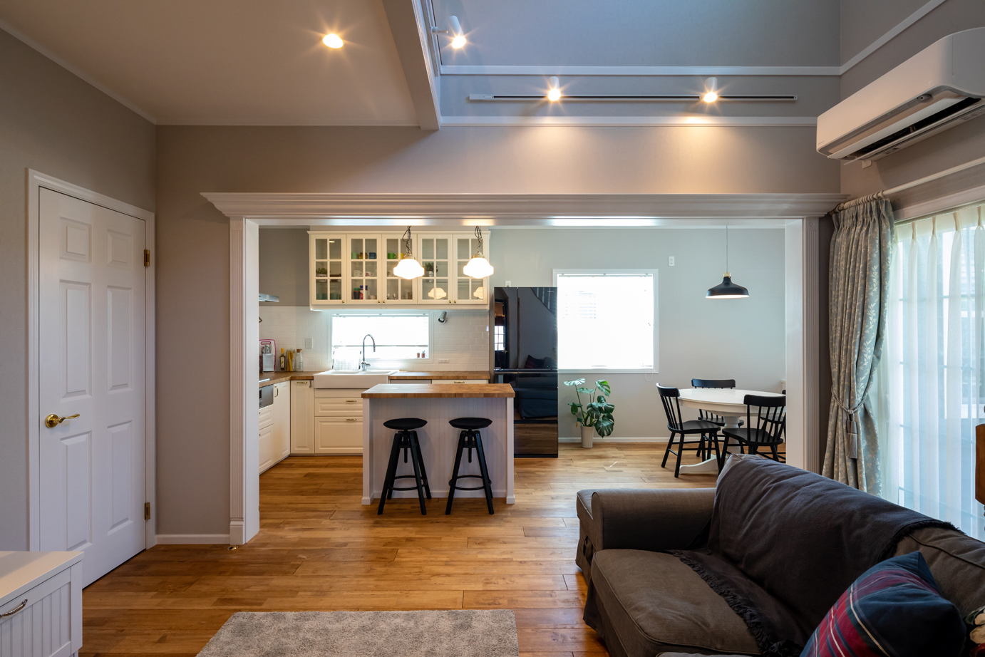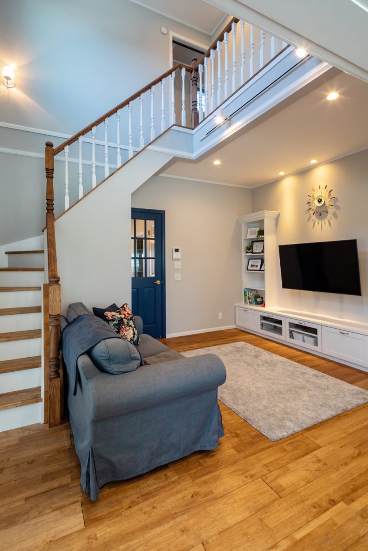 自分たちで土地を見つけ、ビルダー探しをしていたころ、偶然、茂木建設のモデルハウスの前を通りかかった。Yさんは「学生時代にアメリカにホームステイしていたことがあり、アメリカ風の家に住みたいと思っていたんです。モデルハウスが海外の家のような外観で、気になって見学しました」と振り返る。そして「扉の雰囲気や壁紙のセレクトなど全体的なデザインが気に入りました。またこうしたスタイルの家づくりの実績があったので、安心してお願いできると思いました」と話す。