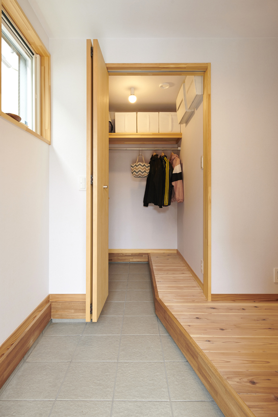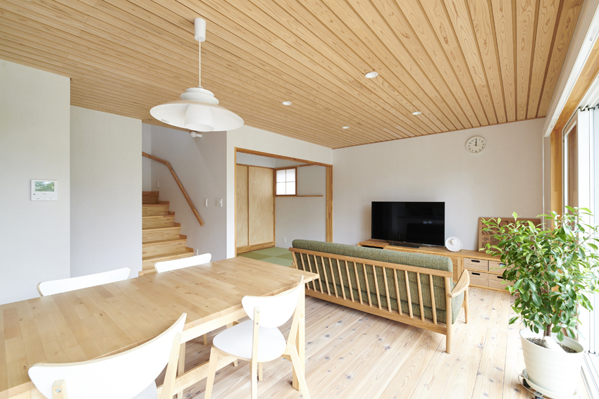 自然光だけで十分に明るいリビングは、ダイニングキッチンと仕切りのない大きな空間に仕上がっている。リビングに隣接する和室は「畳でゴロンとしたい」というKさん希望によるもの。基本的には開放したまま使用し、必要に応じて建具で仕切ることができる。LDKに面した大きな窓からは、ウッドデッキへ直接出ることができる。「庇とバルコニーの奥行きのおかげで、夏は直射日光が入らず、冬になると温かい日差しが差し込んできて、部屋がぽかぽかになるんです。自然の摂理を生かした住まいになっていることを実感します」とKさん夫妻。2階の洋室は必要に応じて寝室と8畳の洋室に仕切ることもできるよう設計されるなど、可変性の高いシンプルな間取りになっている。「長い時間を過ごす住まいが、ライフステージの変化に柔軟に対応しているのは、将来にわたる安心感がありますよね」とMさん。間取りや機能など、自分たちの生活スタイルに必要なものだけを厳選したい。そんな2人の思いが伝わってくる家だ。