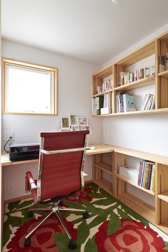 南面に向いた大きな窓から降り注ぐ光が、柔らかく室内を包み込むK邸。結婚を機に家づくりを始めたKさん夫妻は、二人とも木の家が好きだったことから、地元の西方設計のモデルハウスを訪れた。北国における住宅建築の高性能化の先駆者の一人である建築家の西方里見氏が、35年のノウハウを凝縮したモデルハウスを見学したKさん夫妻は、秋田の気候を熟知した高性能な住宅に感銘を受けたという。妻のMさんは高い断熱性能、地元の木材をふんだんに使った木の家という印象で、モデルハウスはまさに理想どおりでした。もともと地元のビルダーにお願いしたいという気持ちもあったので、迷わず西方設計さんにお願いすることにしたんです」とビルダー選びを振り返る。「コンパクトな水回りと大きなキッチン、開放的なリビングなど、要望を叶えてもらいました。こんなに窓が大きいのに、厳冬期もエアコンを1台つけるだけで家全体が温かいんです」とKさんは満足げ。Mさんは「冬も素足で過ごせるんですよ。杉の床板も足ざわりが心地よいです」と話す。