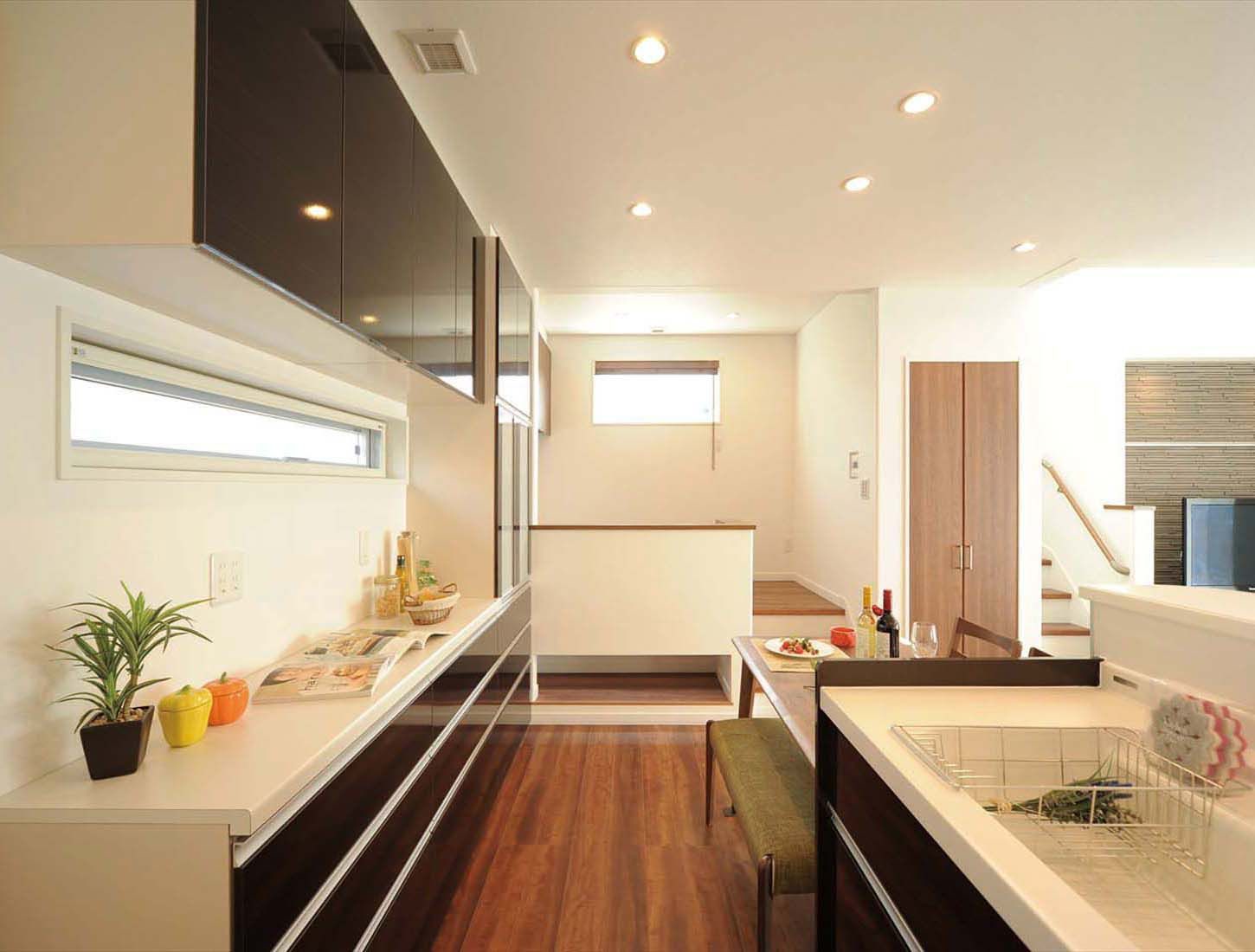 理想としたのは、家族がそれぞれ自分のことをしていても、自然と同じ空間でゆったり過ごせるような家づくり。1階は開放的なリビングを中心に、スキップフロアになったワークスペース、和室までをキッチンから見渡すことができる。