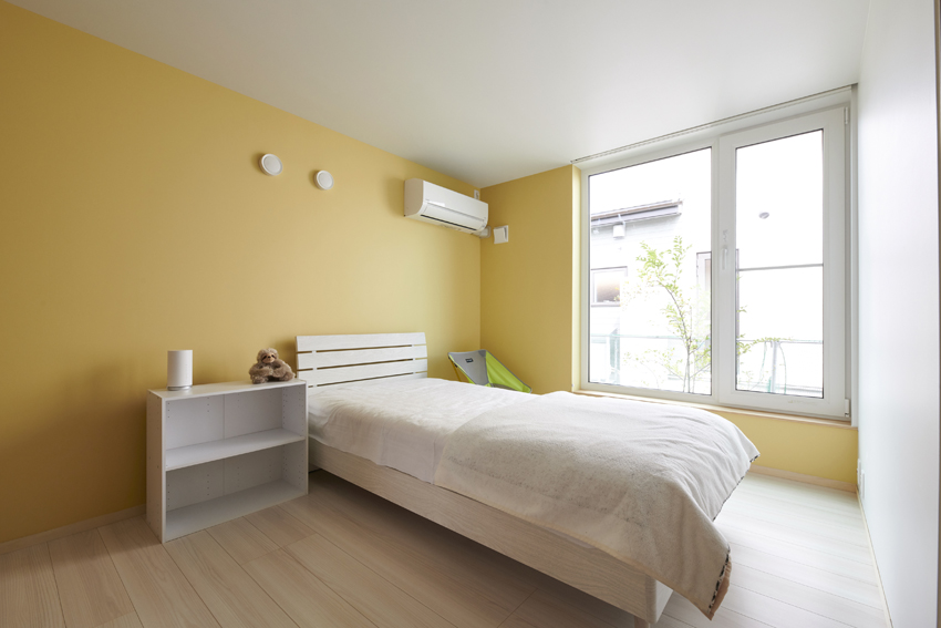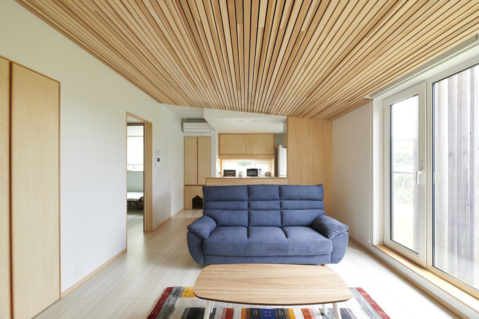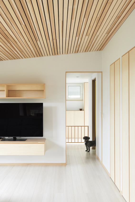 親子3世代が暮らすH邸は延床面積25坪の平屋建て。延べ床面積としては大きくないものの、南側に向かう勾配天井や、廊下に向かって視線の抜けるプランはゆったりとした広がりを感じさせつつ、家族それぞれにも個室があるプライバシーを確保した住まいだ。