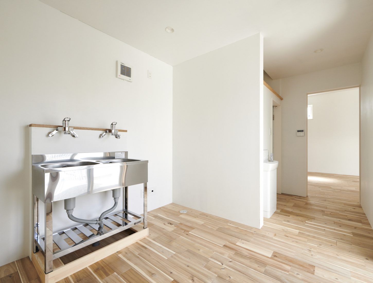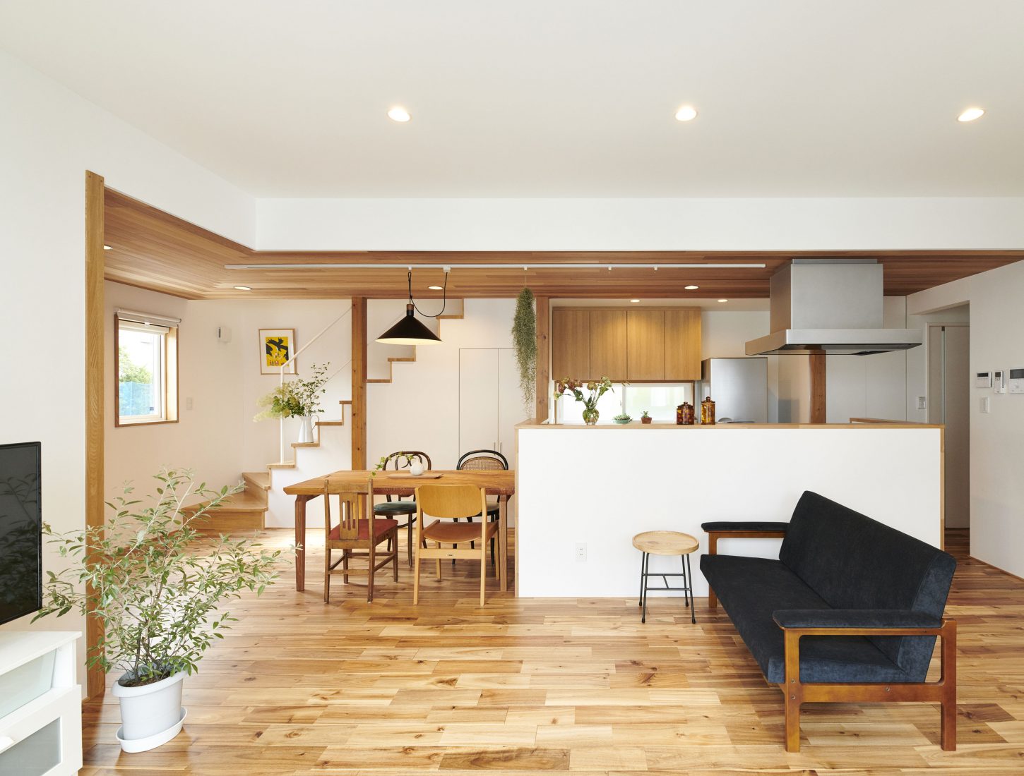 アイランドキッチンを中心としたLDKをはじめ、濃淡の幅が広くまっすぐに走る木目が印象的なアカシアで床を統一したI邸。コの字型にレイアウトされた北側の建物は住居に、南側はカメラマンである妻のNさんの写真スタジオになっている。住居とスタジオをつなぐ前室はNさんの仕事場となっており、住居とスタジオのどちらにもアクセスがしやすい。