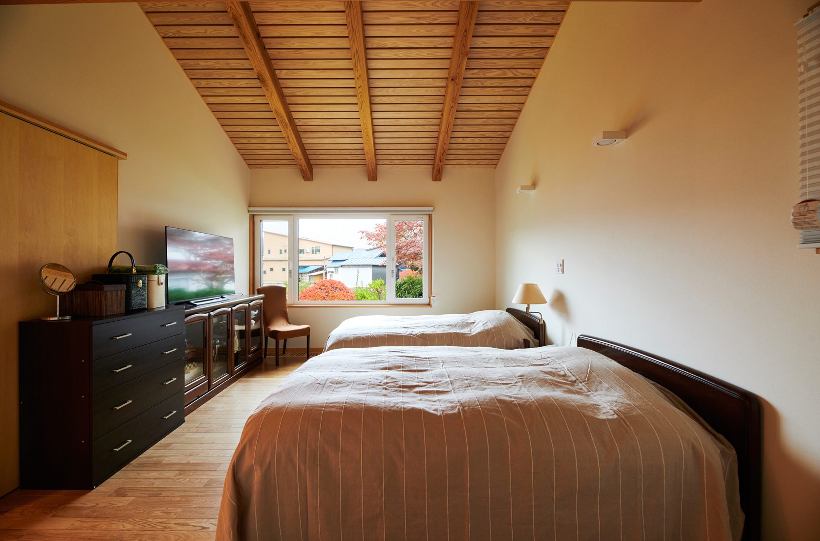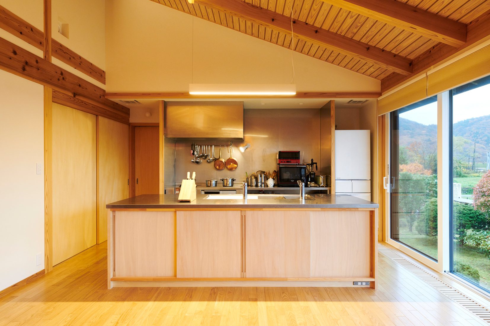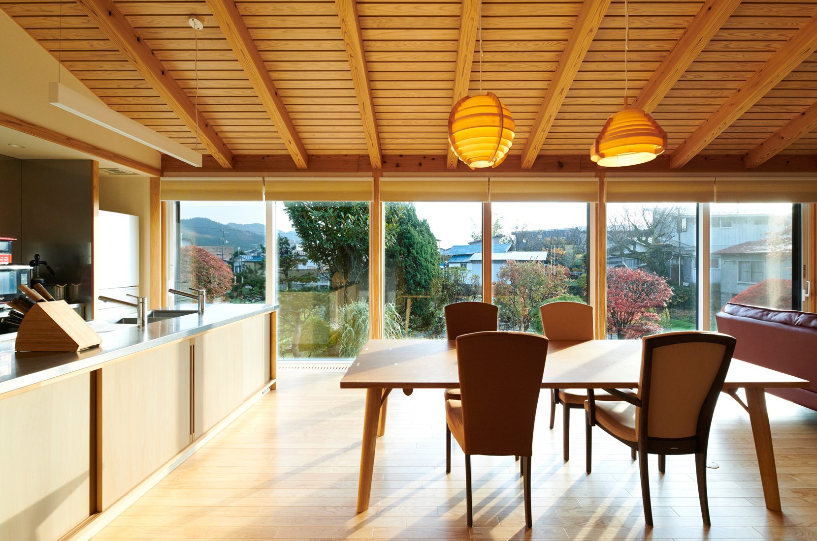リビングダイニングの大窓から望む庭の景色が圧巻のK邸。庭は親の代から引き継いだものだという。平屋切妻屋根の形状をそのまま持ち込んだ室内は天井が高く、大窓からの横への広がりと天井勾配による開放感は、この土地と建物がなせる業と思わせる。