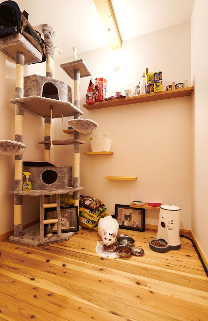 Kさんは普段、この家に一人で暮らしている。妻のSさんが、那須高原で旅館を経営しているためだ。「帰って来ると、この家の快適さを感じます。性能も窓からの眺めも気持ちがいい。室内も開放的で、階段から落ちる心配もない。そして収納。細かくどこに何をしまうのかを伝えて設計してもらい、家族の一員である猫の部屋もつくったことで、家が散らからないんです」とKさん。これからも拠点が分かれる生活が続くそうだが、人生を楽しむ夫婦ならではの暮らしを受け止める平屋だ。