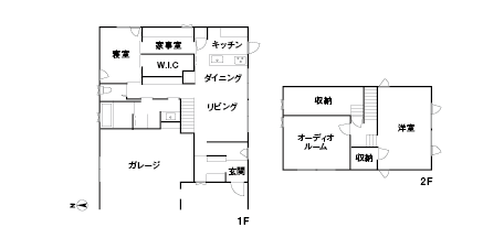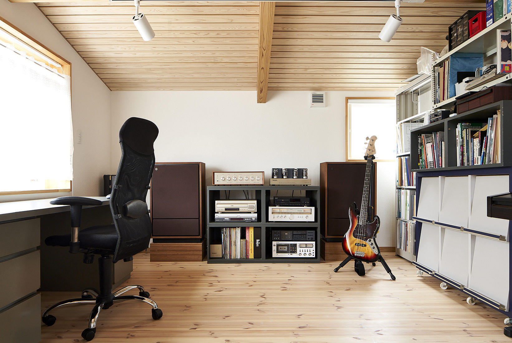 て1階を車いすで移動できるようにした。また、夫婦それぞれのスペースとしてOさんは2階にオーディオルーム、妻のMさんはキッチンに隣接する家事室を設けて、趣味や一人の時間を満喫できる環境を整えた。