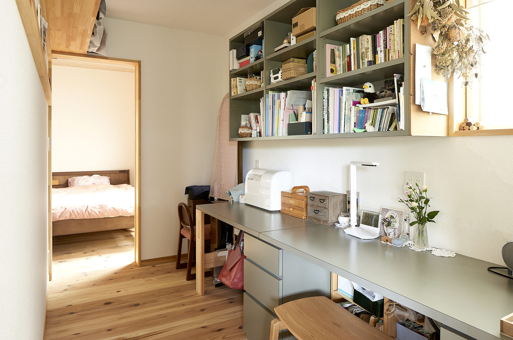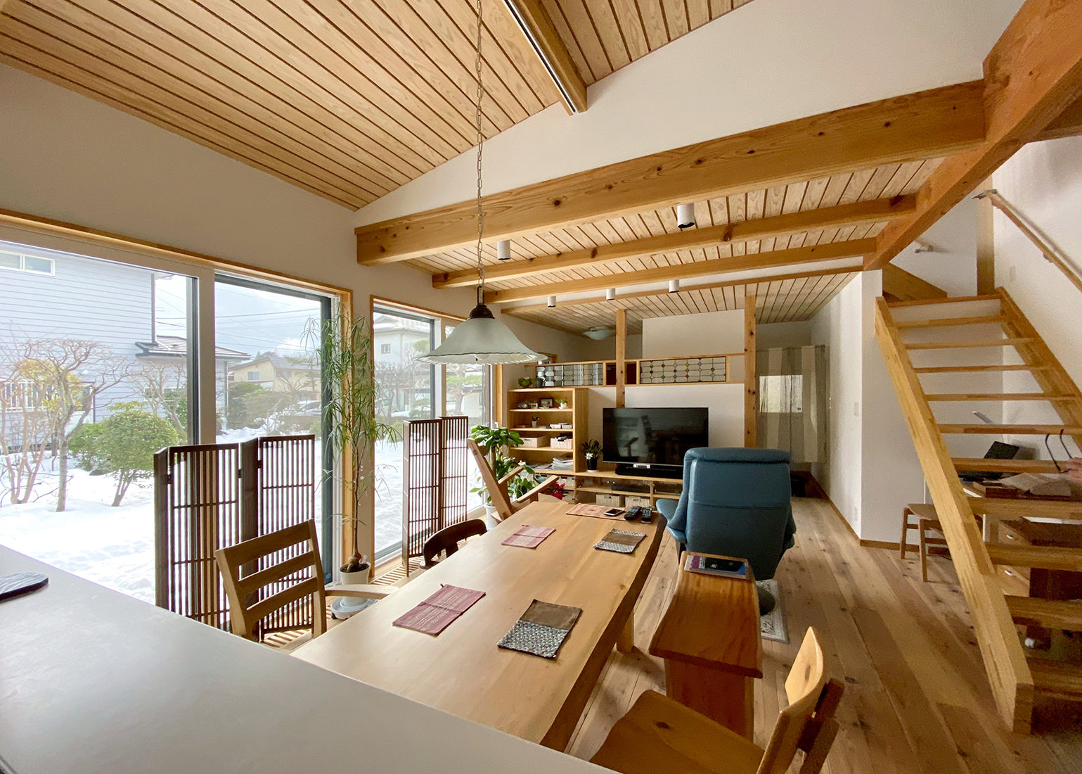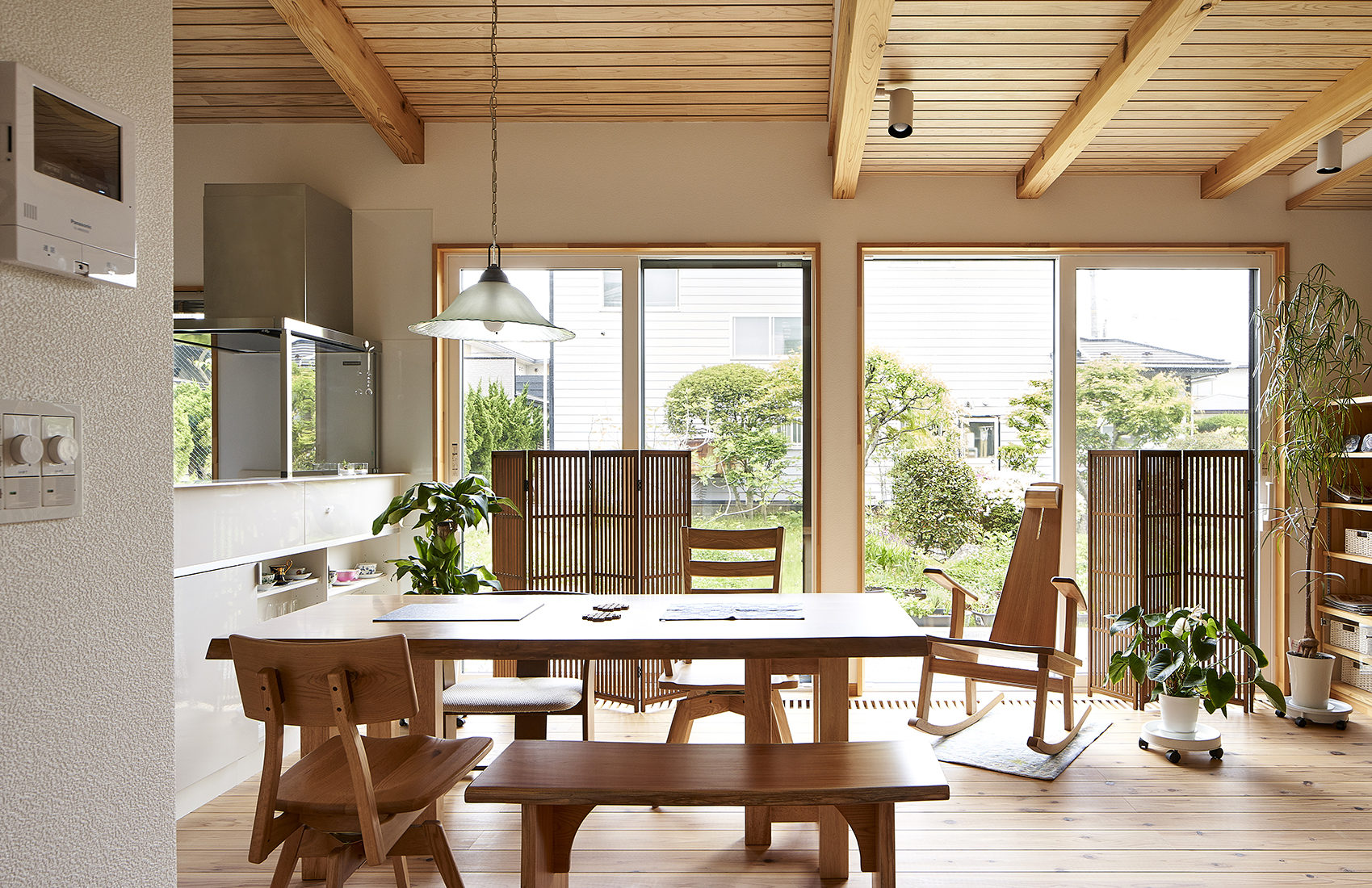 Oさんが住みはじめて実感しているのは「リビングにいるのが本当に心地よい。いつもいい空気が流れていて、天井の杉板などの眺めもとても気に入っている」ということ。Mさんも「家事室を作業途中のままにしておけることが便利。リビングに用事をもちこまずに、くつろいで過ごせます」と微笑む。