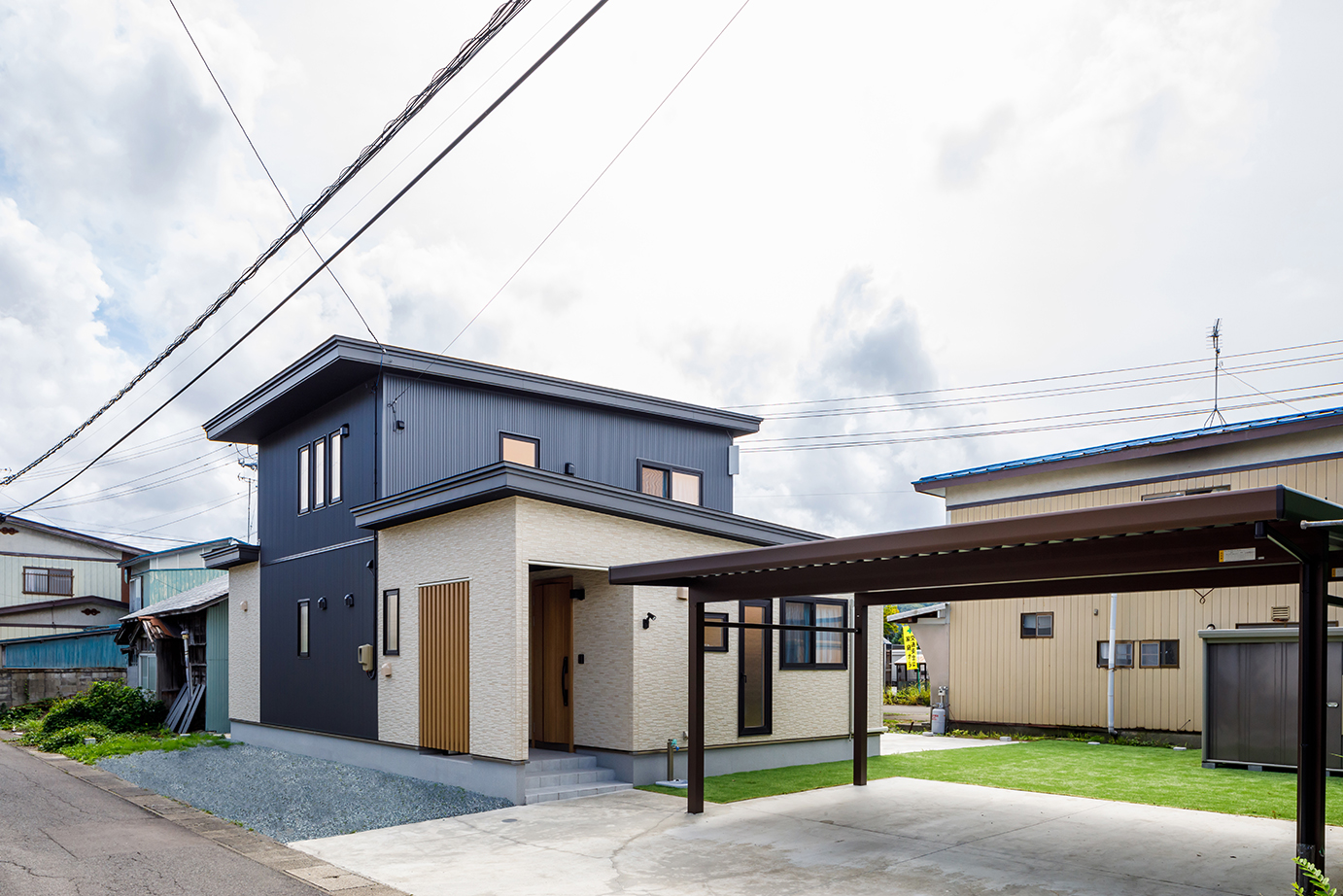 設計・施工 / 株式会社秋田ホーム | 竣工 / 2020/2 | 構造・工法・規模 / 木造枠組壁工法(2×4)・2階建 | 敷地面積 / 348.15㎡(105.31坪) |床面積 / 119.24㎡(36.07坪) / 1階 75.85㎡(22.94坪) 2階 29.81㎡(9.01坪)ポーチ 13.58㎡(4.12坪)