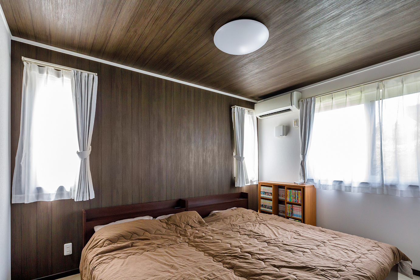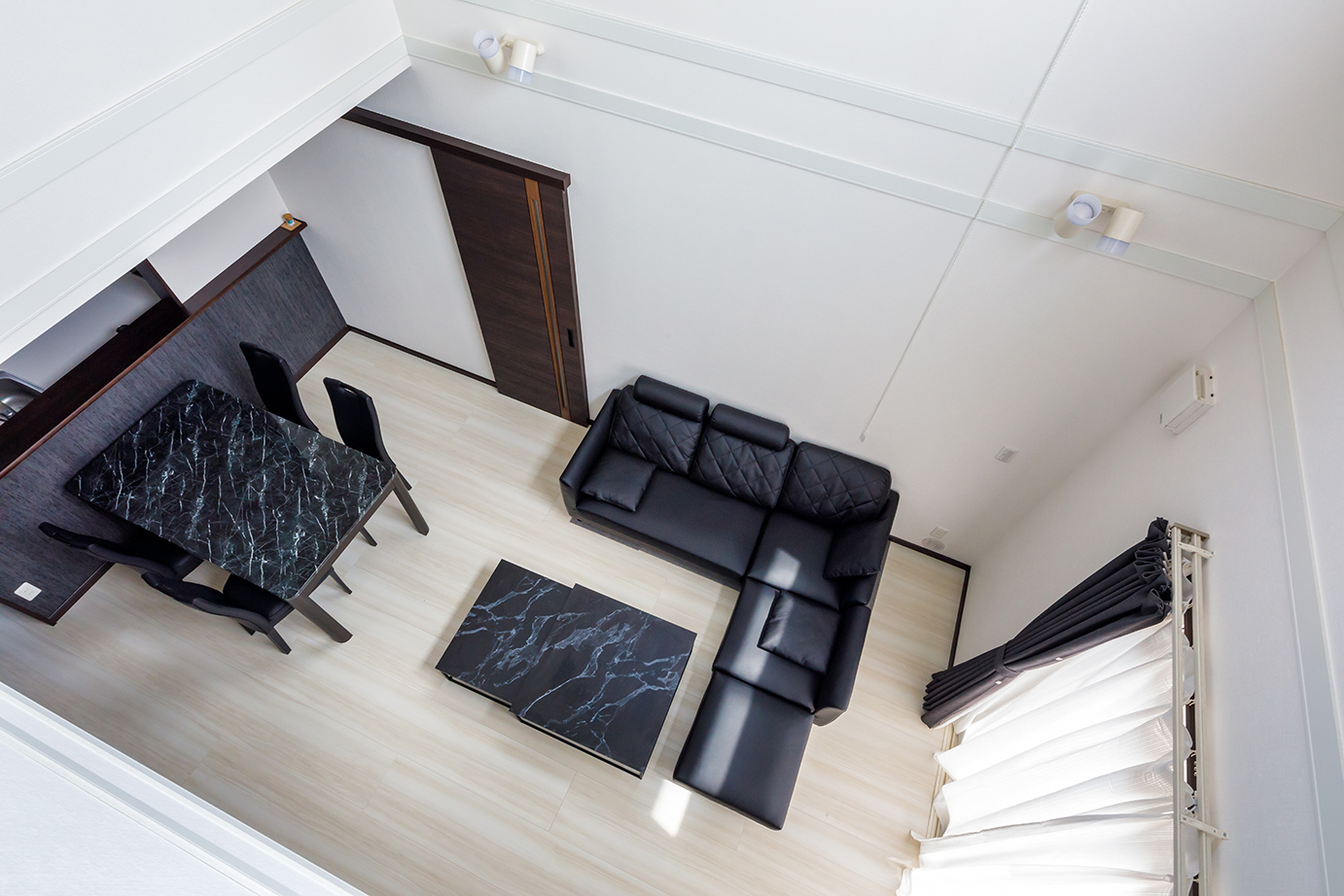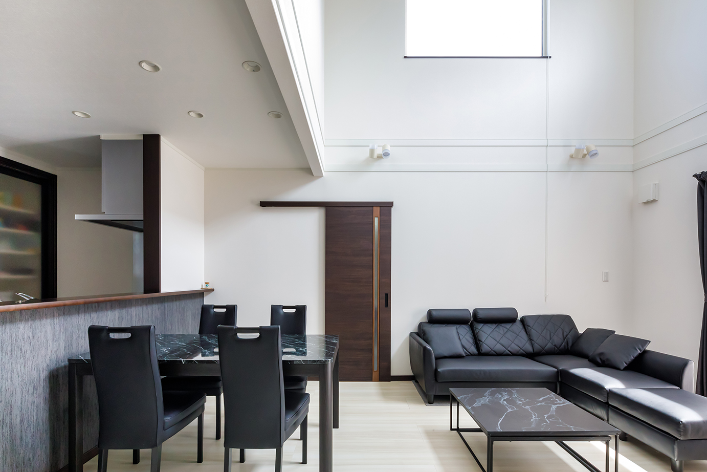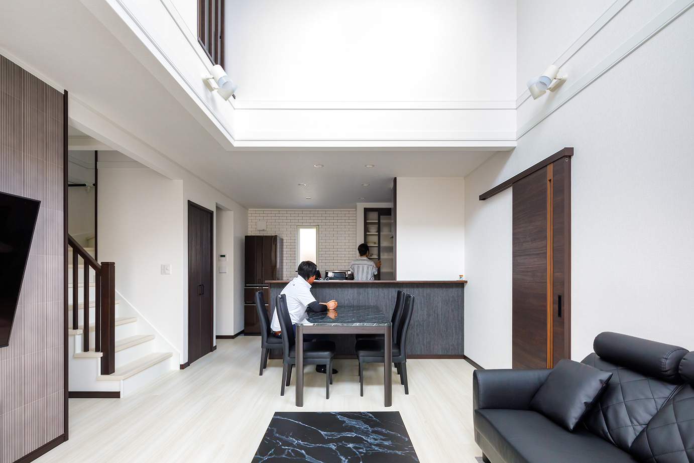 白壁のシンプルな内装にダークブラウンの内装を基調としたS邸。リビングは吹き抜けになっており、子どもたちの個室と内窓でつながる。リビングの吹き抜け2面に配した高窓からは光が降り注ぎ、開放感あふれる空間が実現している。