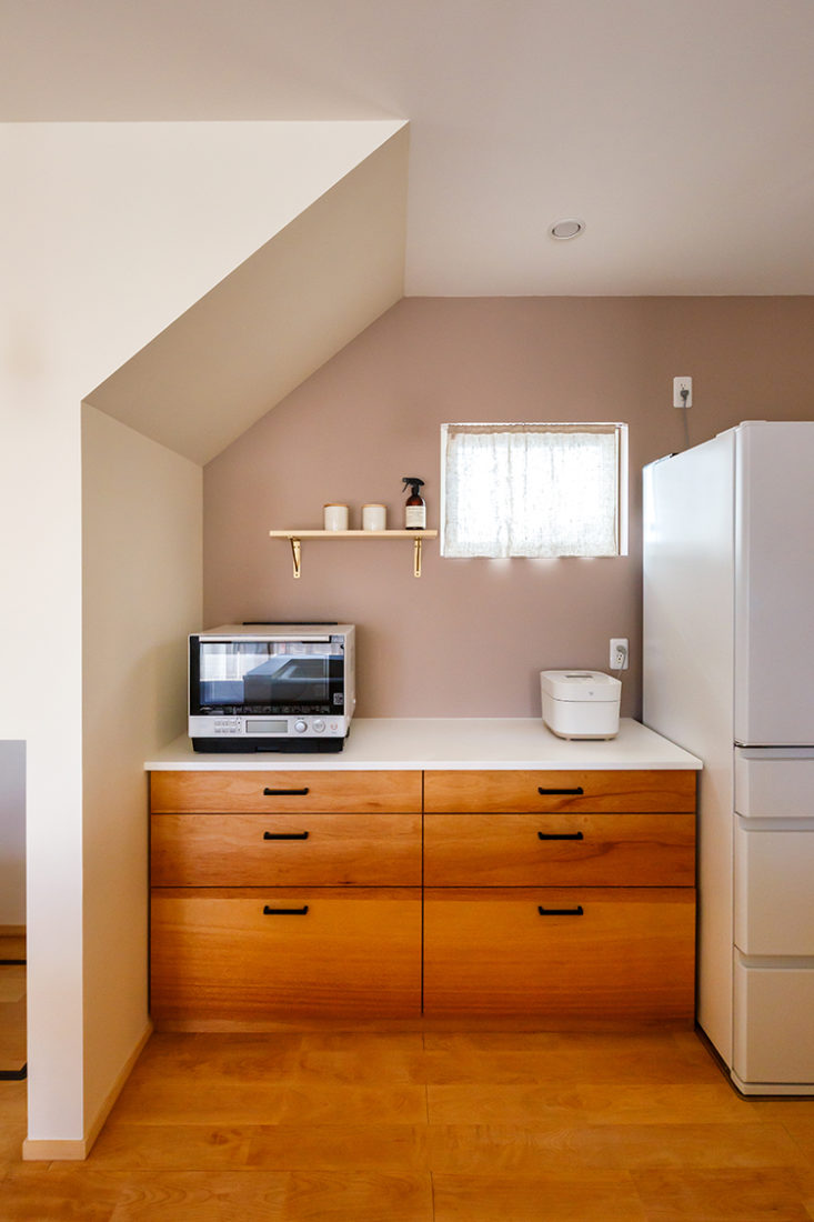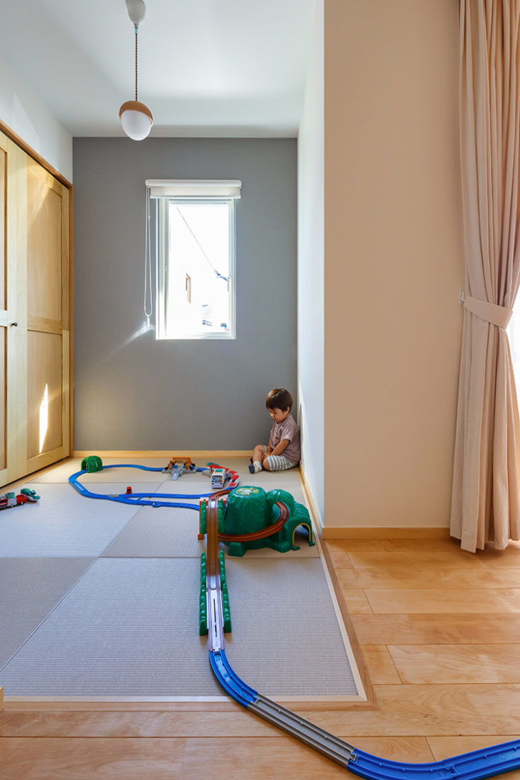 キッチンから見えるところに畳のスペースを設けたのは、妻のYさんの希望。キッチンに立ちながら、長男が遊んだり昼寝をしたりしているのを見守ることができる。また、Yさんの役割が大きかったのが、壁やアクセントウォール、建具の色決めだったそう。1階の壁塗装の色の選択肢はおよそ1000種にものぼる。膨大ななかからこれと思うものを選ぶのは大変な作業だが「楽しんでやってもらった印象で、色のチョイスは私たちにも参考になりました」と設計・施工を行った代表の佐藤さん。