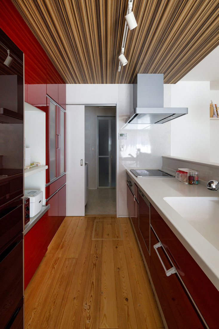 I邸のプランは、キッチンから子どもたちの様子がわかること、無垢材や珪藻土クロスなどの体に優しい自然素材をふんだんに利用すること、リビング階段を採用してどんなときも子どもたちの顔が見えるようにするなど、子育て世代には特にうれしい配慮がなされている。「我が家では夫婦ともにキッチンに立つので、キッチンを基点にしたレイアウトはとても合っています」とIさんも満足げだ。