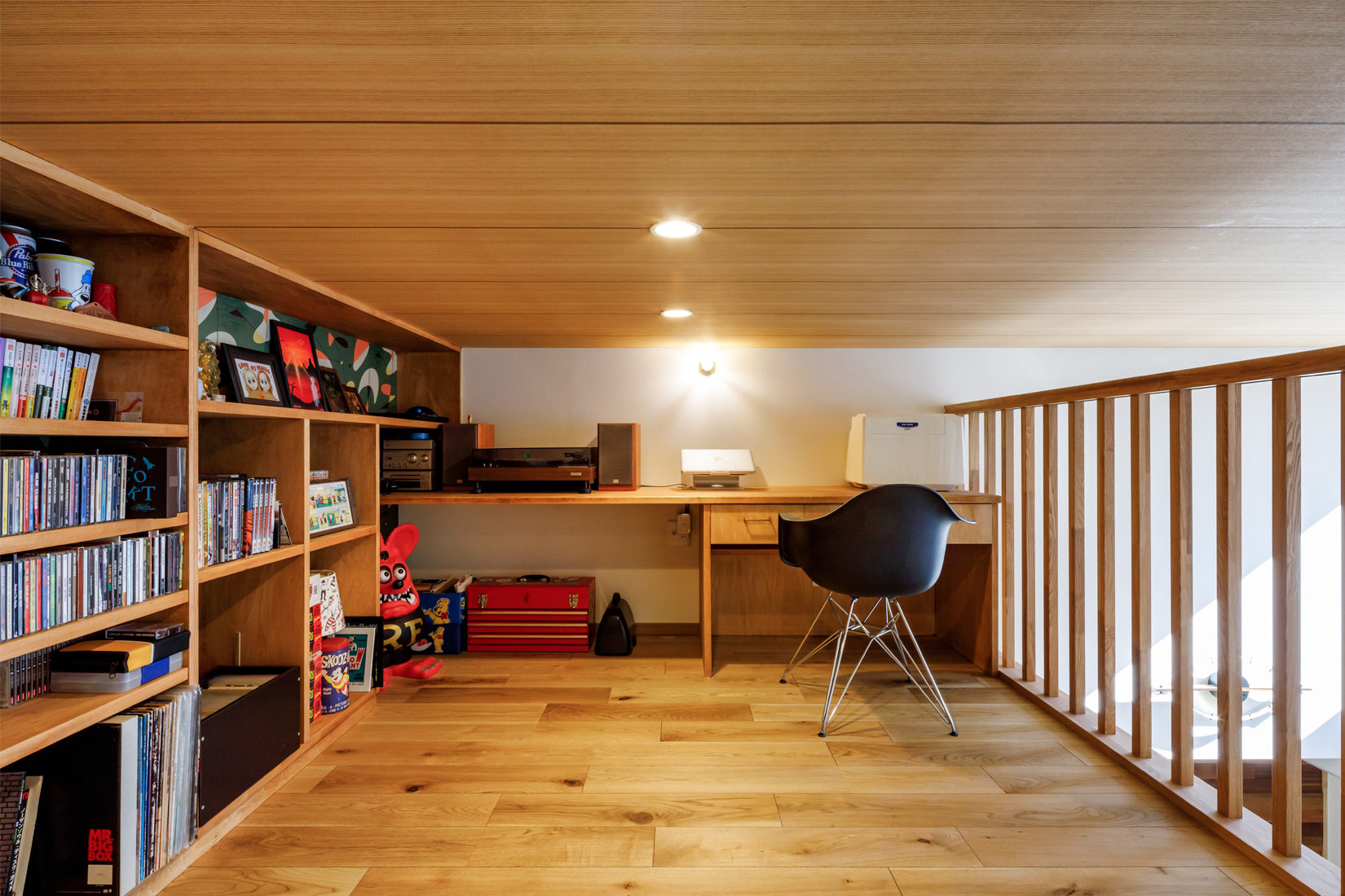ロフトの壁一面にはCDやLPレコード、フィギュアなどを収納する棚が、
