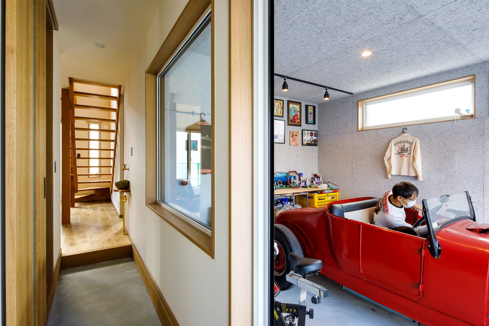 K邸では土間玄関を長めに設け、インナーガレージの大きなはめ込みの内窓からフォードのモデルTを眺めることができる。