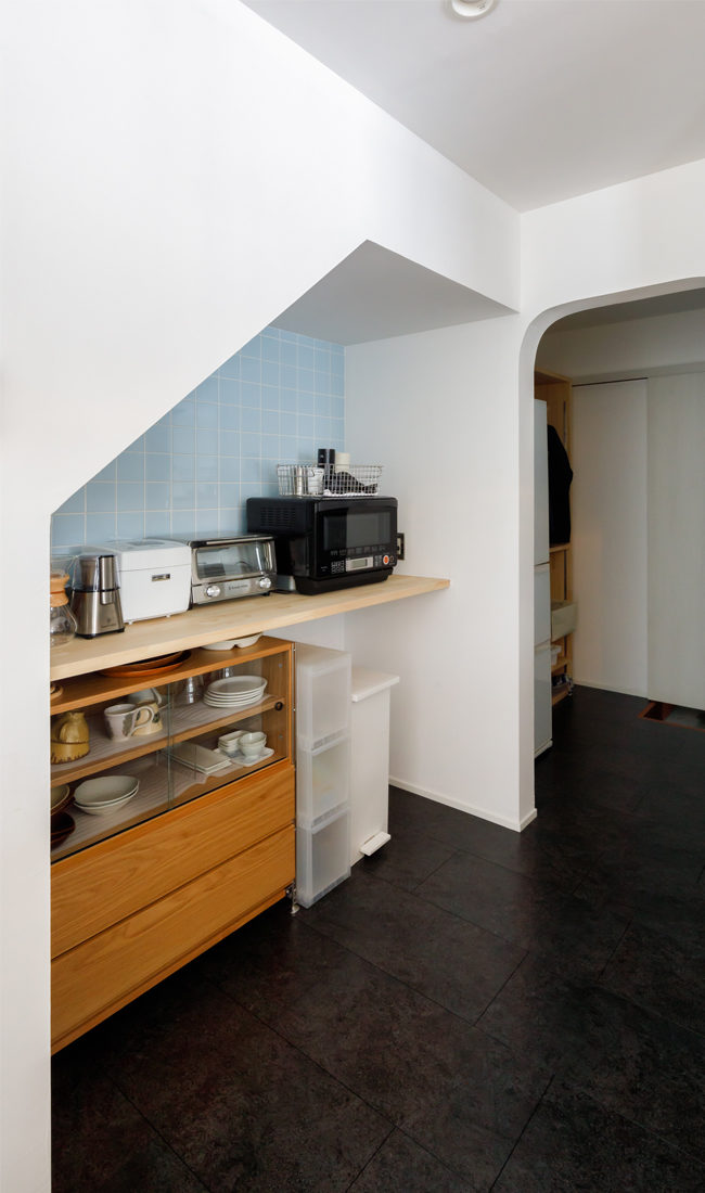 居室はインテリアの映えるすっきりとした空間に保てる。キッチンは角丸形のアール壁や、