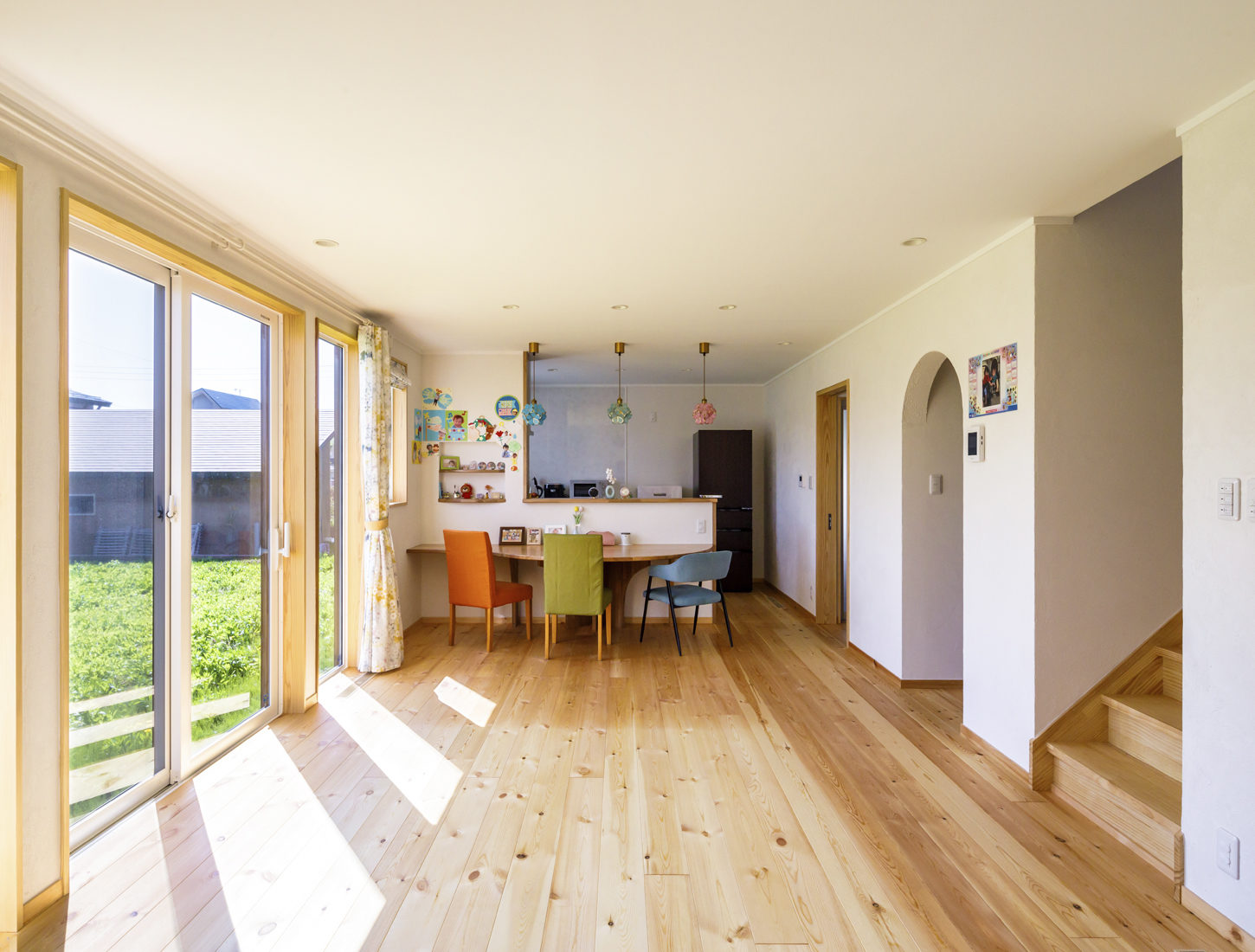 「村岡組デザインでは定番となっている白い漆喰の壁と無垢のパイン材の床は、